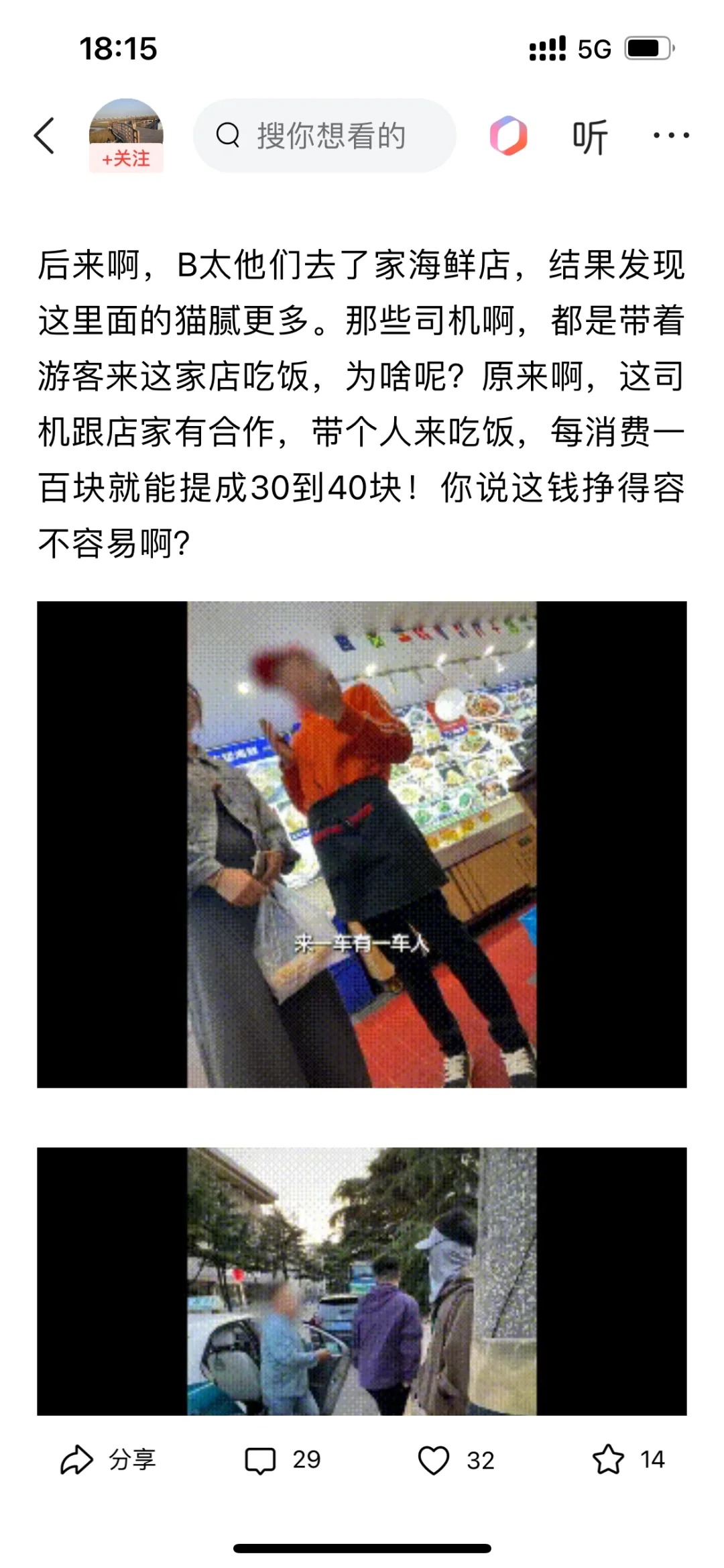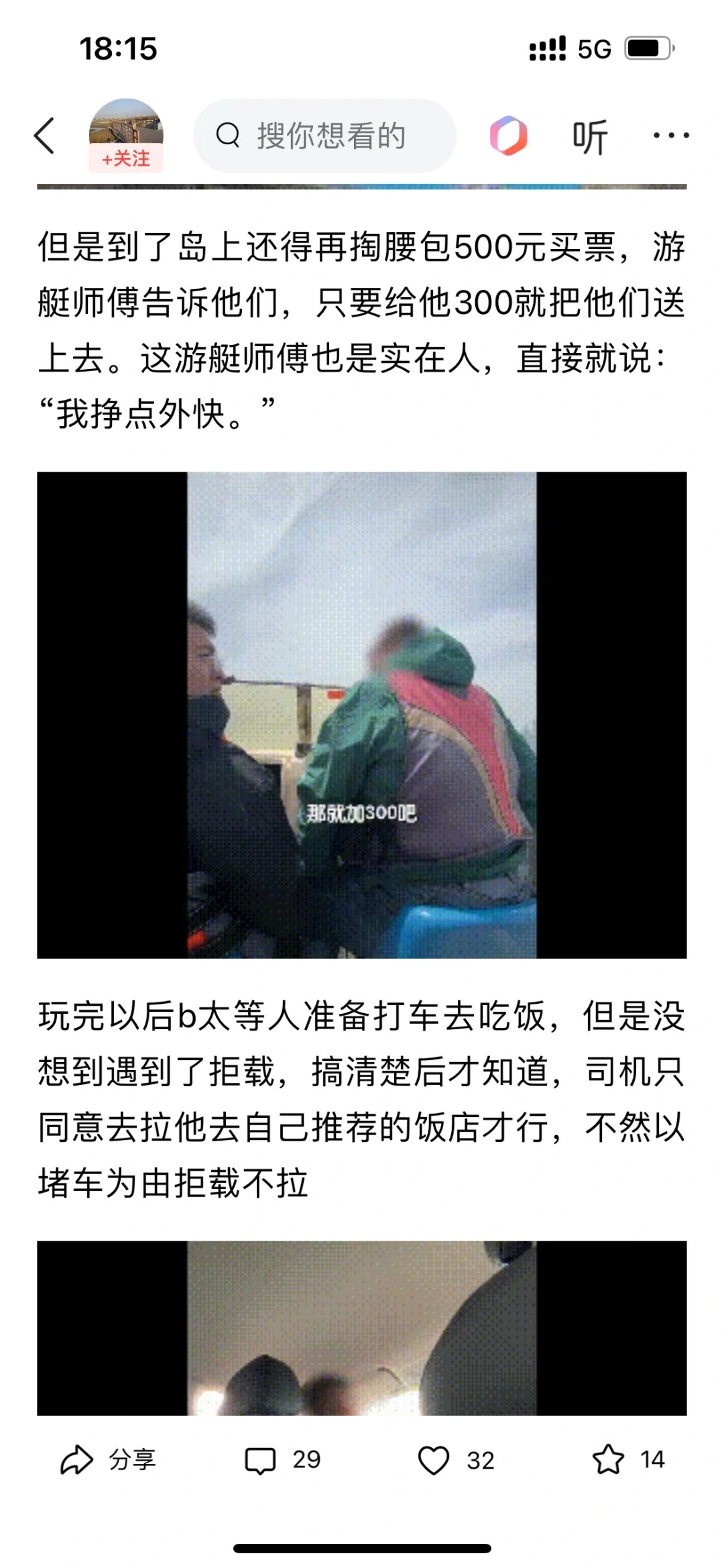 小黑柴阿德利 29 2024-04-27 17:31 青岛旅游不是不能来,但是一定不要盲目来。有个本地朋友给指指路是最好的,没有的话就尽量选免费景点或者正规的公营景点。比如崂山,海底世界,极地,海军博物馆,栈桥,鲁迅公园,一浴三浴沿海一线步行道啥的,不会坑。西海岸的景点要慎重,尤其是一些网红但最近几年才红起来的。西海岸旅游基本是大碴子垄断的,看看三亚就懂。再就是切记,不要在景区里吃饭,做好功课,打个车出来,去居民区吃。不要和司机鬼扯,你就报目的地,去就行。你问“哪里海鲜好吃”,那就是送人头的 梧桐 回复 05-03 10:27 没本地朋友就不能来了 明道 回复 05-10 07:34 一点不错,全中国景区里,别吃饭,别买东西,都一样,说的很对[点赞][点赞][点赞]