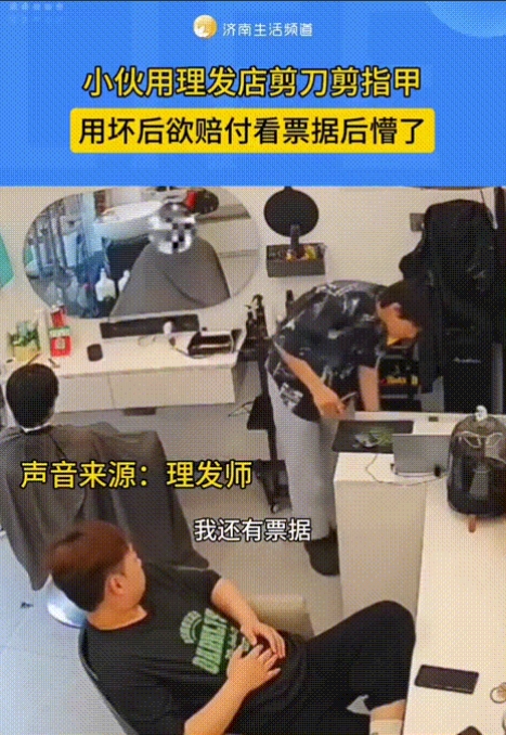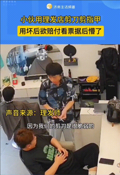 福建龙岩,一男子到理发店剪头发时,因等待理发师期间无聊,拿起桌面上的一把剪刀剪手指甲。理发师发现后,拿出购买时的收据要求男子赔偿1800元。男子听后觉得理发师是在“讹人”,拒绝赔偿。