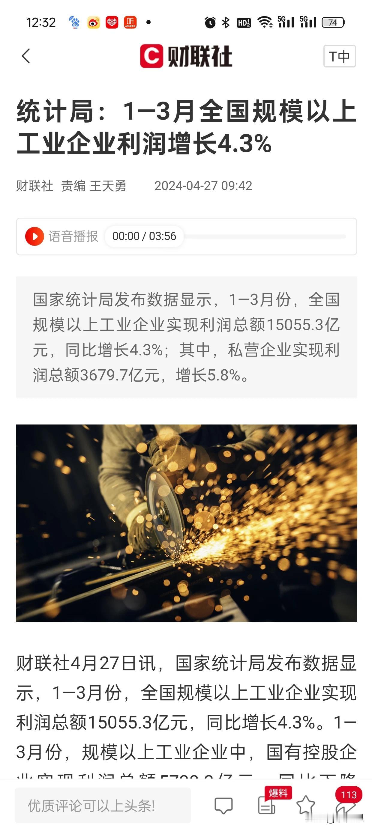 水电煤一季度利润增加40%? 1一3月份,全国规模以上工业企业实现利润总额15055.3亿元,同比增长4.3% 国企利润5738.2亿元,同比下降2.6%; 私企利润3679.7亿元,增长5.8%。 电力、热力、燃气及水生产和供应业实现利润总额1921.2亿元,增长40.0%。 (老索看到这里感慨万千,民生保障的东西怎么会增长40%???谁给解释一下) 计算机、通信和其他电子设备制造业利润增 82.5%。 (老索说,高科技方向业绩不错,算力,光模块,核心文章没白研究) 有色金属冶炼和压延加工业 增长57.2% (有色业绩开始恢复) 电力、热力生产和供应业增长47.5%, (电企收益相当好,旱涝保收) 煤炭开采和洗选业下降33.5% (煤下降周期已开始了) 黑色金属冶炼和压延加工业亏损增加。 (传统钢铁不能玩) 3月末,规模以上工业企业资产总计169.14万亿元,同比增长6.1%;负债合计96.85万亿元,增长5.7%;所有者权益合计72.29万亿元,增长6.6%;资产负债率为57.3%,同比下降0.2个百分点。 (中国企业部门风险可控,除了地产方向,其他板块还好)