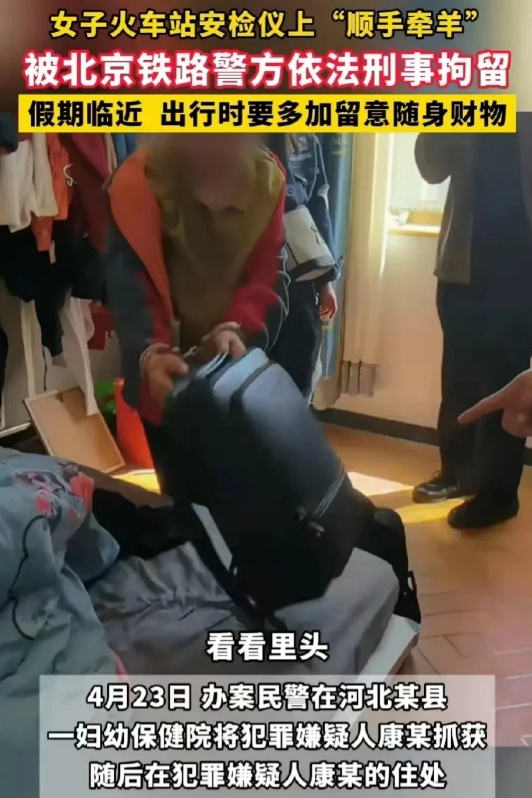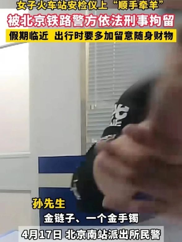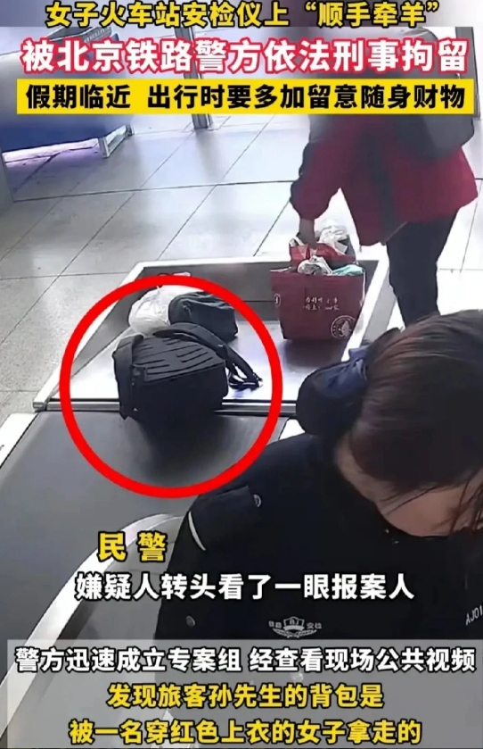 北京,一男子在过安检时,背包却丢了,里面有金链子,有金手镯。男子报警。警方查看监控,发现被一名身穿红色外衣的女子顺手牵羊拿走了。警方驱车来到河北,将这名女子抓获,被盗的黄金也找回了。