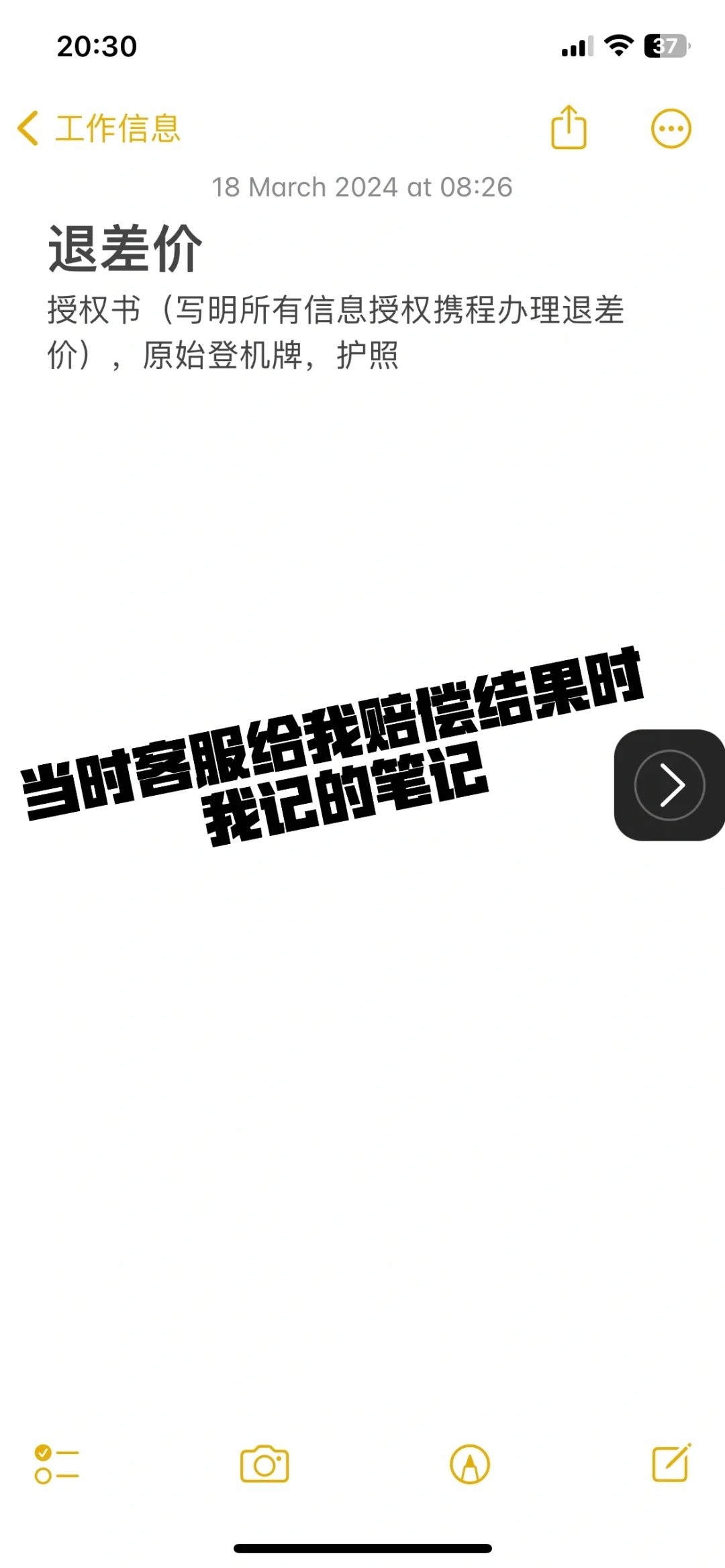 2024年2月8日(图1),我被携程通知非自愿降舱(巴黎来回北京的两段航段,后一段截不到消息因为前序航班天气原因晚点担心来不及转机改签了,现在只显示改签信息),此后一直在打跨国电话联系客服处理,每次都是说核实核实,每次接电话的人都不一样,花了我一百多跨国话费一个多月才终于在2024年3月18日得到准确消息(图2我当时记的笔记)。说是坐完了飞机可以退差价,另外可以帮忙代申请降舱赔偿(图3航司官网信息),需要保留好机票。