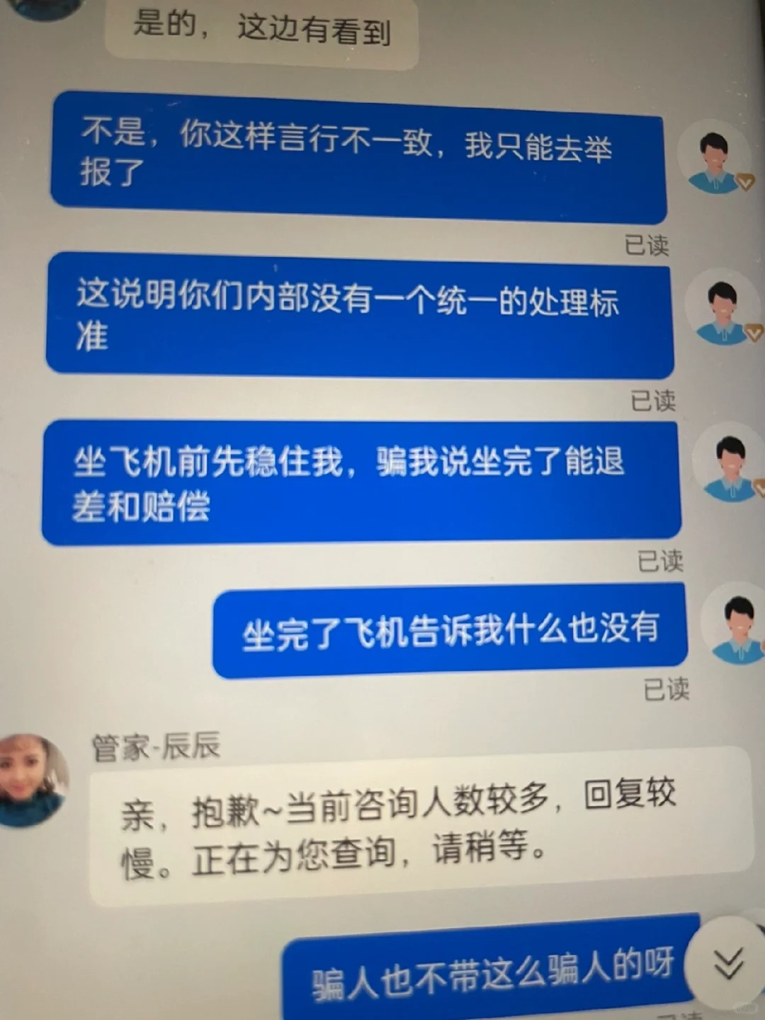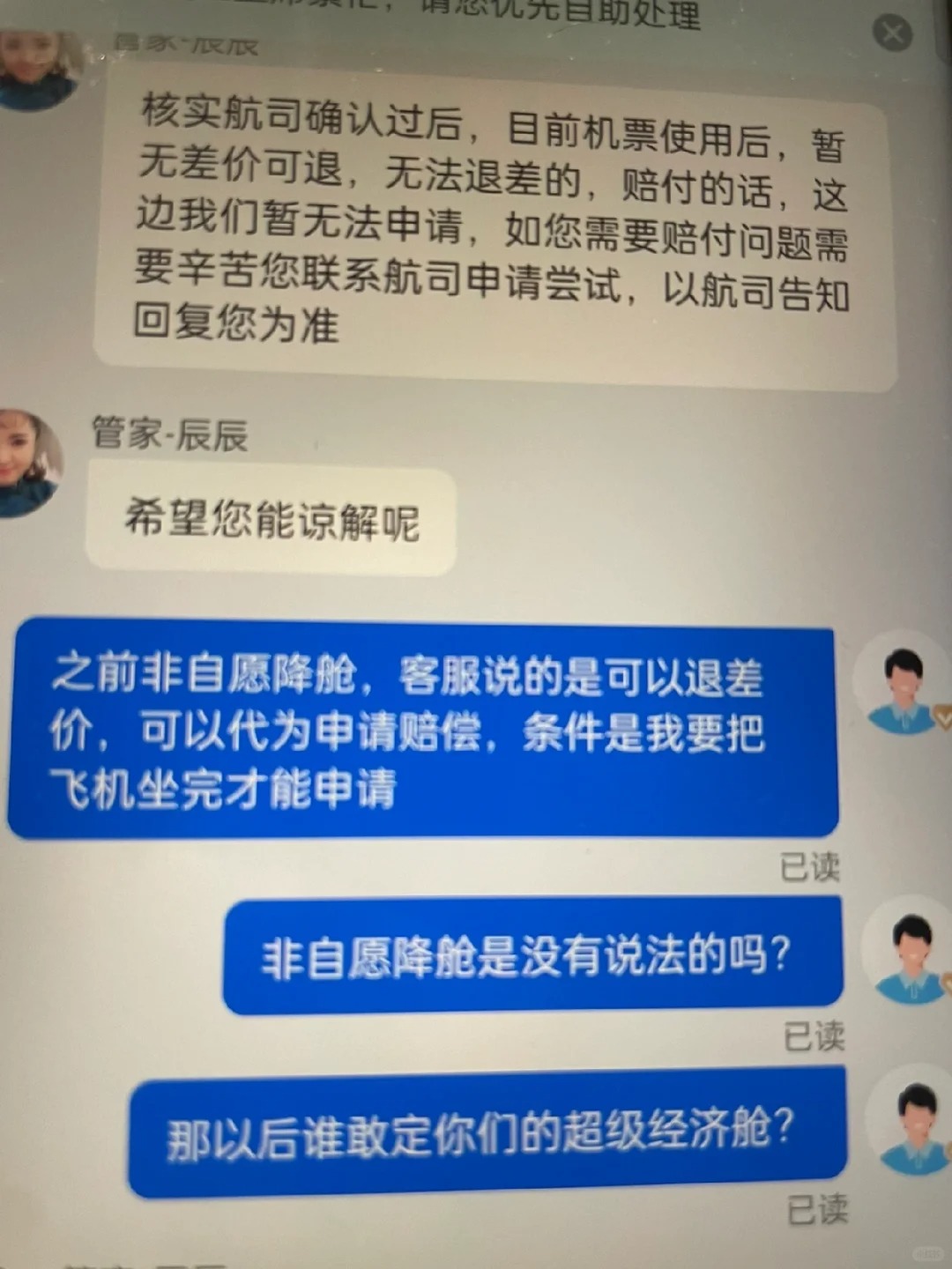 等等,你跟我说坐完了飞机才能退差赔偿,现在坐完了飞机告诉我因为已经坐完了所以不能退差价了?这不是把消费者骗到坑里宰吗??