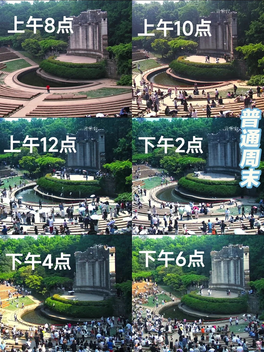 已攻克!南京音乐台几点过来?五一假期旅游 宝子们! 为了研究这一问题,我煞费苦心哈哈,本着理科生的严谨逻辑~观察了各个时段的人流量(图123),包括工作日、普通周末、节假日。又分析了各个时段的光影、鸽子活跃度等等,闲话少说,上干货! . 【先说结论】:音乐台和中山陵紧挨着,一般游客会先去中山陵,但我要告诉你,早上到了先去音乐台才是正确玩法! . 【关于时间】:早8点之前,不论工作日还是节假日,体验感均佳,10点开始人流量开始激增,越晚越多,峰值出现在下午5点,中午最热的12-15点体验感不佳,温度高人又多,鸽子活跃度也低 . 【关于光影】:拍照最好的是夕阳时分,日光和煦,把宝子们的脸照的巨美,也就是摄影师常说的magic time~早上也很不错,中午光线虽然足,但是睁不开眼啊 . 【何时人少】工作日早9点前,堪称包场~独享音乐台的浪漫~节假日8点30前也还不错 . 【鸽子动态】:鸽子何时飞?其实没有一成不变的规律,因为鸽子是动物,有自己的选择,但根据我的观察,上午11点左右、下午4点左右似乎很活跃,常常绕场盘旋转,浪漫的~ . 准确的说:全年top时段是秋季工作日的下午4-5点~不过现在春天也不错,是民国感和嫩绿的碰撞~当鸽子绕场的那一刻,宝子们就穿越到了民国~