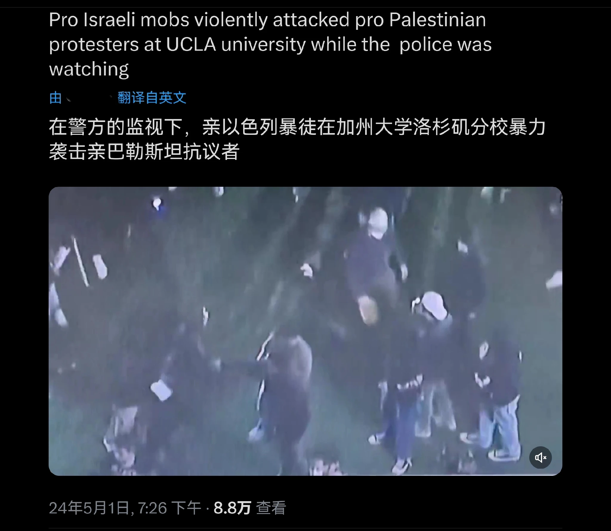 他们校园内甚至涌入了拿着狼牙棒的亲以色列暴徒,上来就朝学生头上挥过去。而本应保护他们的学校保安和叔叔,就站在后方一百米处观看。最后暴徒撤出,他们再进场拆除学生的营地。目前仍有少部分学生在营地坚守,但互相之间被分割开来,无法报团。