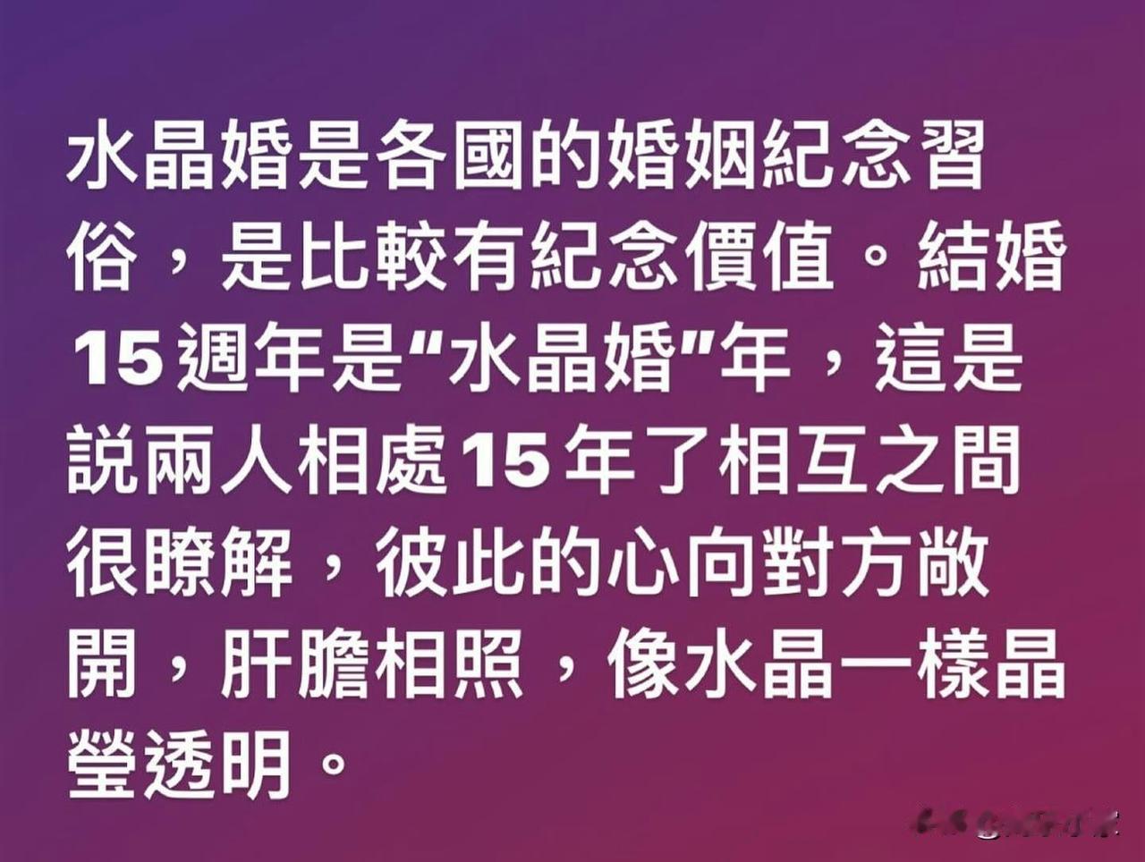 💖汪明荃与罗家英撑枱脚贺水晶婚,刚做完白内障手术要戴黑超兼素颜! 💖汪明荃(Liza姐)与罗家英相爱多年,两人在2009年在美国拉斯维加斯注册结婚,婚后经常出双入对,羡煞旁人,更是圈中的模范夫妇。适逢今年结婚15周年,昨日(3日)Liza姐跟家英哥一起食饭庆祝,她在社交平台晒出合照,并写道:「多谢家英送我玫瑰花及请食晚饭。结婚15年了,时间过得真快,希望以后大家都健康快乐!开开心心!」 💖照片中所见,家英哥为太太送上一大束玫瑰花,两人又撑枱脚庆祝,相当浪漫。不过Liza姐就戴着黑超合照,原来是刚刚做了白内障手术,她透露:「医生要我戴黑超防强光及避灰尘入眼,也不能化妆,休息2星期。」汪明荃又贴出「水晶婚」寓意的截图:「水晶婚是各国的婚姻纪念习俗,是比较有纪念价值。结婚15周年是『水晶婚』年,这是说两人相处15年了相互之间很了解,彼此的心向对方敞开,肝胆相照,像水晶一样晶莹透明。」 💖汪明荃与罗家英因合演《穆桂英大战洪州》相遇并相恋,罗家英曾多次求婚但遭汪明荃拒绝,直至2019年才决定结束20年爱情长跑,正式注册结婚。汪明荃在2002年患上乳腺癌及甲状腺癌,当时罗家英一直陪伴她战胜病魔,到了2004年底,罗家英患上肝癌第3期,汪明荃也对他悉心照料。两人先后经历过大病,在抗癌路上互相扶持,不离不弃。