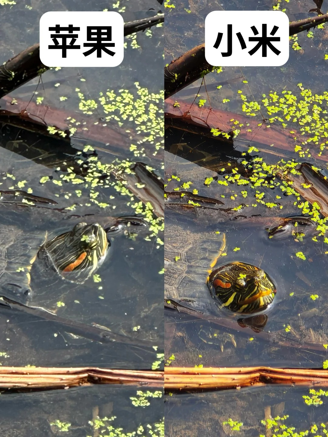👉🏻清晰度上,长焦情况下,小米的清晰度明显要比苹果高很多,细节处理的也更好,乌龟的花纹、水底也都清晰可见