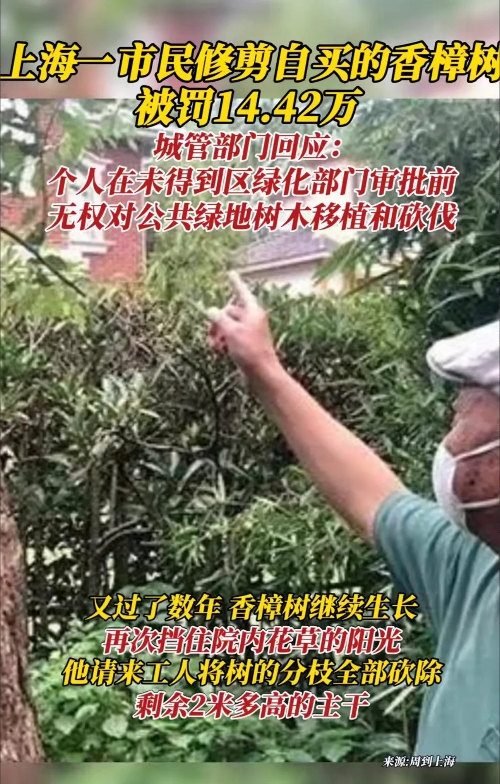 上海,一男子花1.1万,买了一棵香樟树,种在自家院子里,10多年后,香樟树越长越大,遮挡了家中阳光,男子便将树移到院外,并将树修剪成只剩2米高树干!岂料,城管竟以砍伐公共绿化为由,对男子罚款14.42万元! (来源:南方都市报)