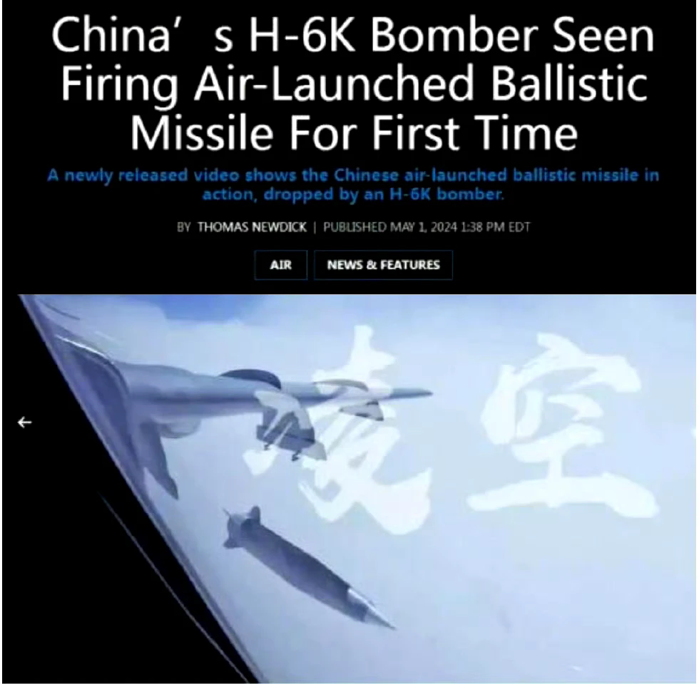 这段轰-6K发射空射弹道导弹的视频,来自中国空军五一期间最新发布的宣传片。对解放军武器装备高度敏感的美国军事媒体“战区”网站(War Zone),立即进行了报道。尽管这个发射空射弹道导弹的视频片段只有不到一秒钟,但从导弹外形判断,与两年前在珠海航展首次露面的空射弹道导弹几乎一模一样。