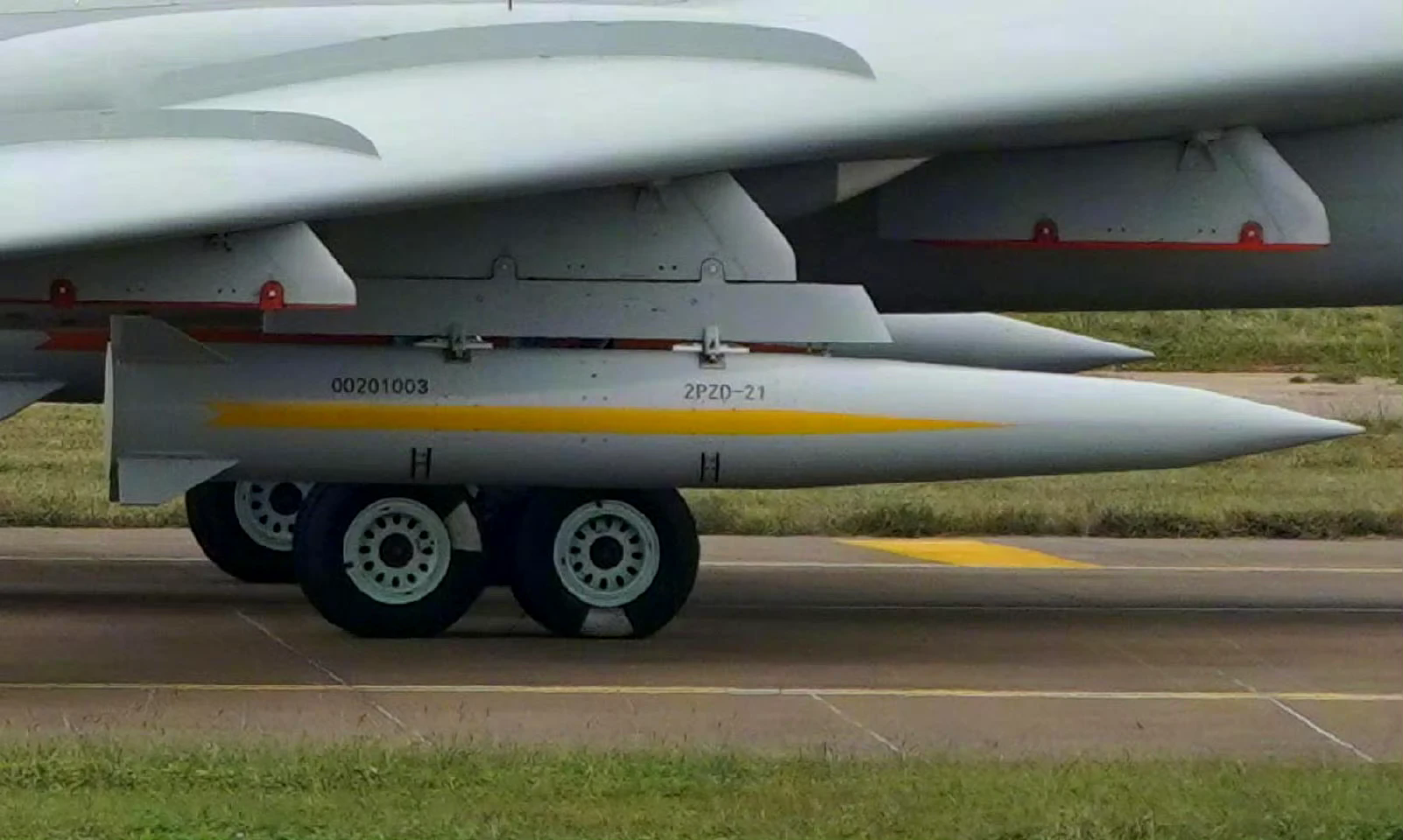 在2022年珠海航展期间,中国空军一架轰-6K轰炸机挂载着一款空射弹道导弹降落在航展现场,导弹挂载在轰-6K轰炸机的内侧机翼挂架下方,弹体上有“2PZD-21”字样。这是中国首次公开展出由轰-6K携带的空射弹道导弹。