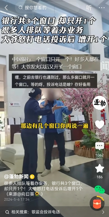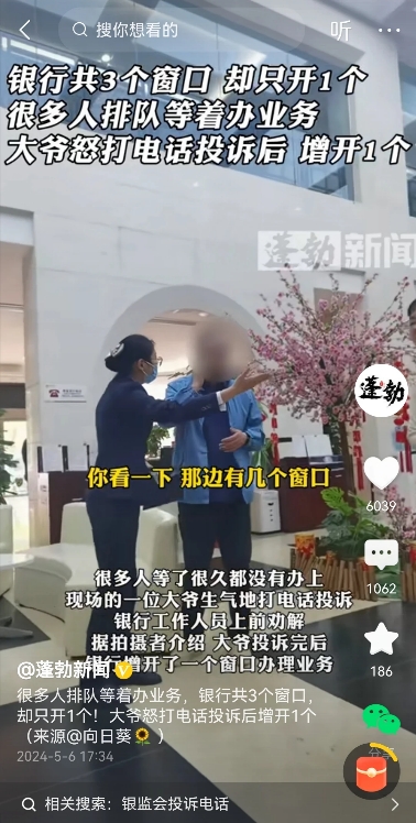银行向大爷解释一番后,仍然没有多开窗口的意思,大爷一气之下,直接打投诉电话进行了举报。银行最终无奈,只得临时新增了一个窗口。