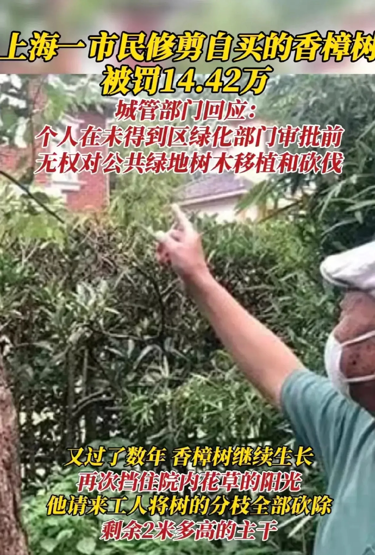 城管又闯祸了!上海,男子在10年前,花了11000元买了棵香樟树。考虑到随着香樟树越长越大,遮挡了大部分阳光。男子便将香樟树移栽到院外,并对树干进行修改。没想到,城管竟以“破坏公共绿化”为由,对男子罚款144200元,最后的结果让人想不到。