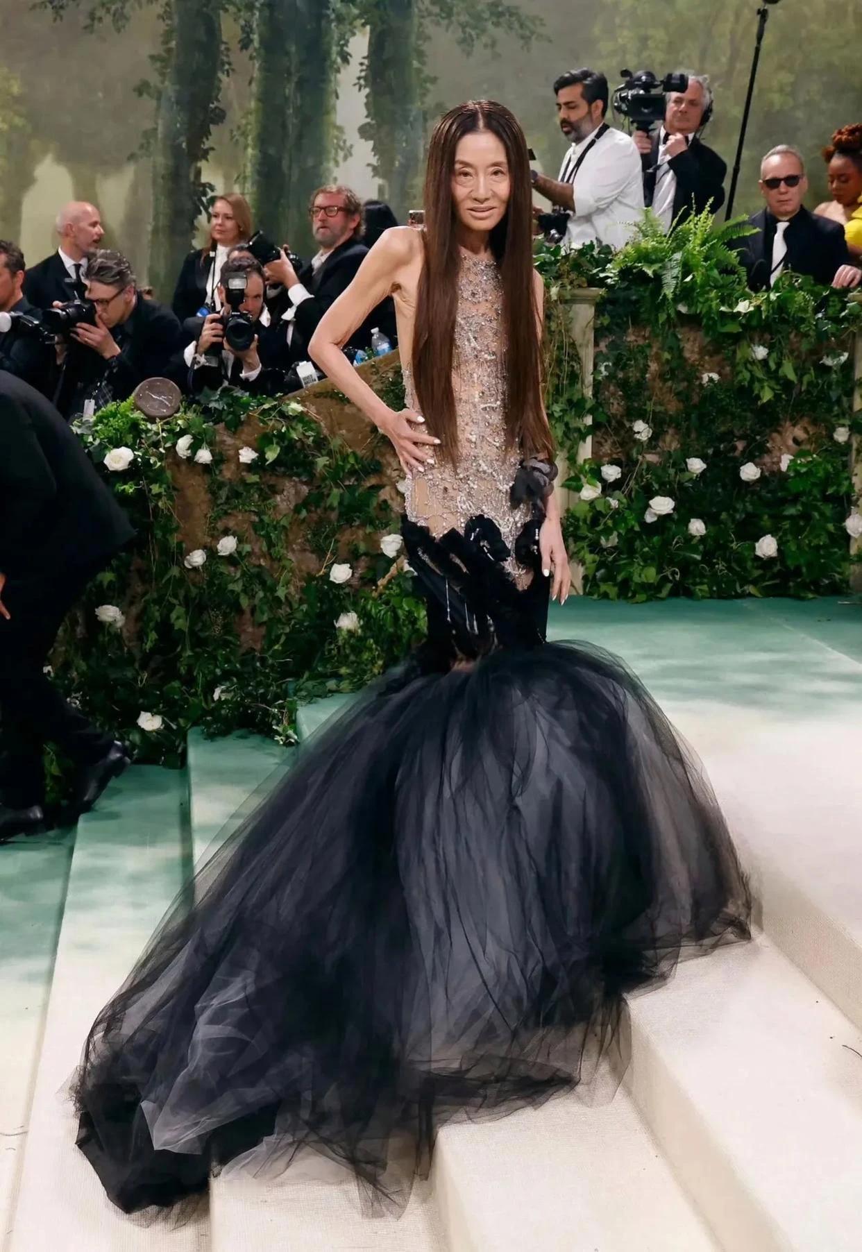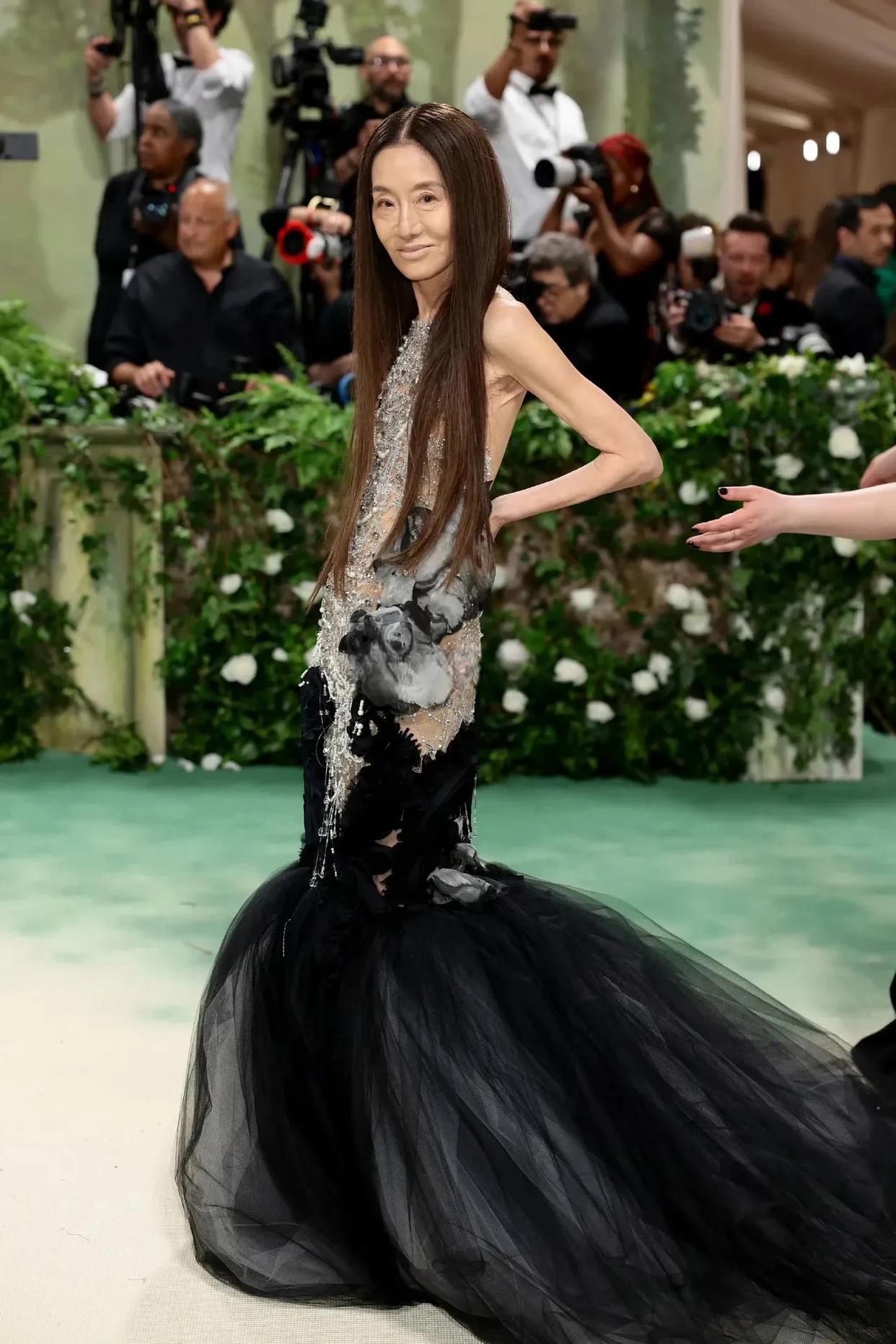 太吓人了,75岁的婚纱女王王薇薇参加 Met Gala 时尚盛典,穿着自己设计的花朵裙,展现出骨感身材,裙子很美,但她已经瘦到皮包骨了,简直就是病态瘦啊,脸和手臂看着真吓人,上了岁数还是胖点好看