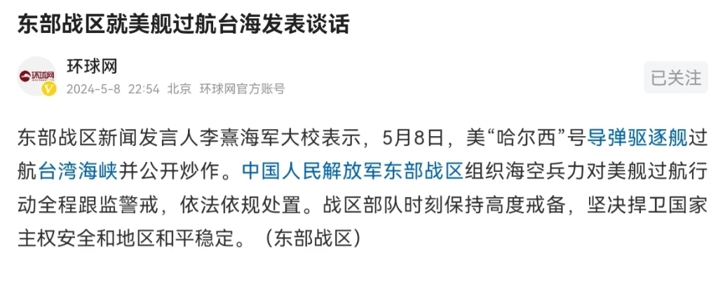 美国军舰穿越台海来挑衅,我们强硬回应,对于美国的毛病,我们可不惯着!5月8日,根据国内媒体报道,就在美菲举行联合军演之际,美国的“哈尔西”号导弹驱逐舰突然穿越台湾海峡,对我们进行挑衅。不仅如此,在穿越台湾海峡之际,美国方面还大肆炒作炒作。