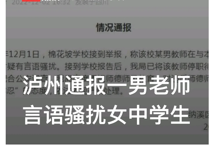 四川泸州,一男教师多次言语骚扰、引诱初中女生,被警方拘留。