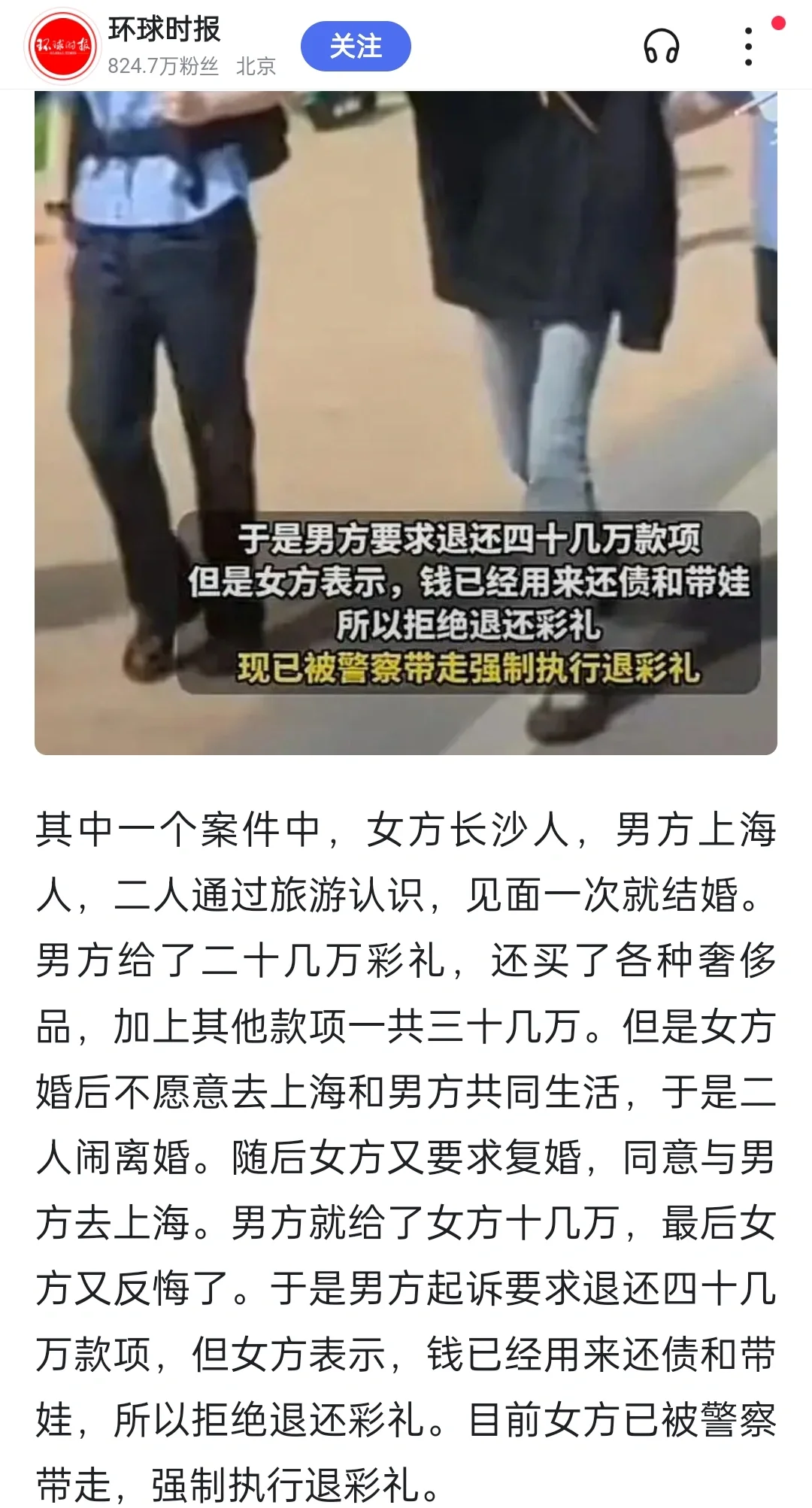 在环球时报上看了一个新闻,湖南这几天举行了一个退彩礼的活动,其中狠狠的曝光了一些借闪婚来获得高昂彩礼嫁妆的行为,其中还有一人声称钱全部拿来还债和带娃了直接拒绝退还,直接被警察带走强制执行了,真是大快人心啊,希望广大受婚姻欺骗的男同胞们都能获得此等正义。