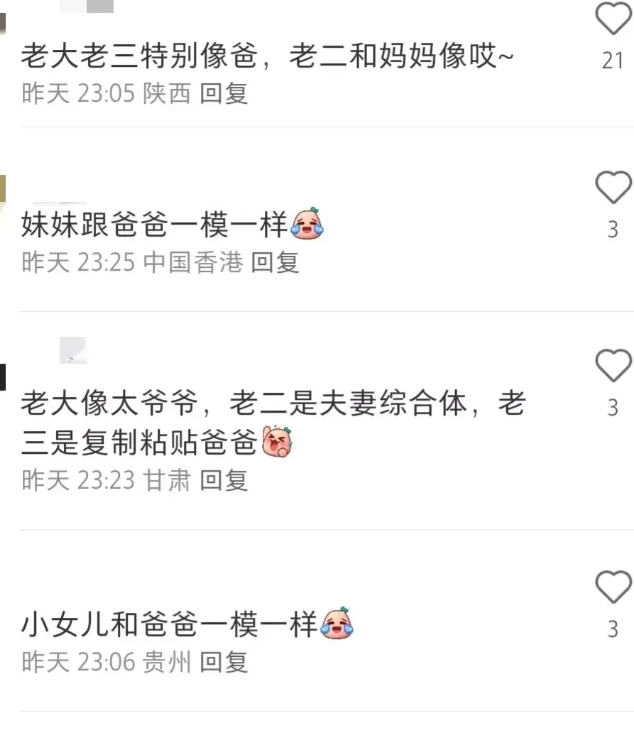 不少网友看了郭晶晶与三个孩子的合照后,都纷纷表示老大霍中曦和小女儿老三长得像爸爸,尤其是小女儿和爸爸霍启刚简直是一模一样。