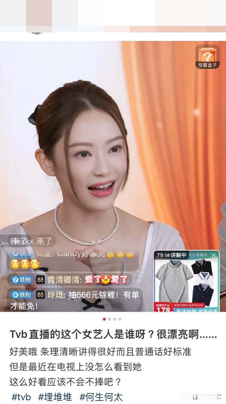 💖TVB小花和黎诺懿直播带货,被网友指外貌极似杨卓娜杨茜尧两姐妹 💖31岁TVB小花叶蒨文(Sophie)在TVB剧集《爱·回家之开心速递》中饰演的Candy,深受观众欢迎和爱戴,自此她的人气渐增加,更获得剧集的拍摄机会。叶蒨文日前和黎诺懿直播带货,而当中他们直播的片段画面被网友转发到「小红书」,有不少网友指叶蒨文外貌极似杨卓娜杨茜尧两姐妹。 💖影片中的叶蒨文扎起马尾头示人,当天她穿上圆领上衣,露出迷人锁骨。其实她已经不是第一次被网友讨论样貌似杨卓娜,她在去年演出无线剧集《隐形战队》其中一幕的剧情被绑在床上,当时更以胶纸封口,仅露出双眼。当时杨卓娜也有看到叶蒨文的演出片段,并在社交网笑称也认错是自己,并表示:「我差点以为是我。」之后相继也有网友留言指叶蒨文是「比杨怡更像是杨卓娜的亲姐妹」。