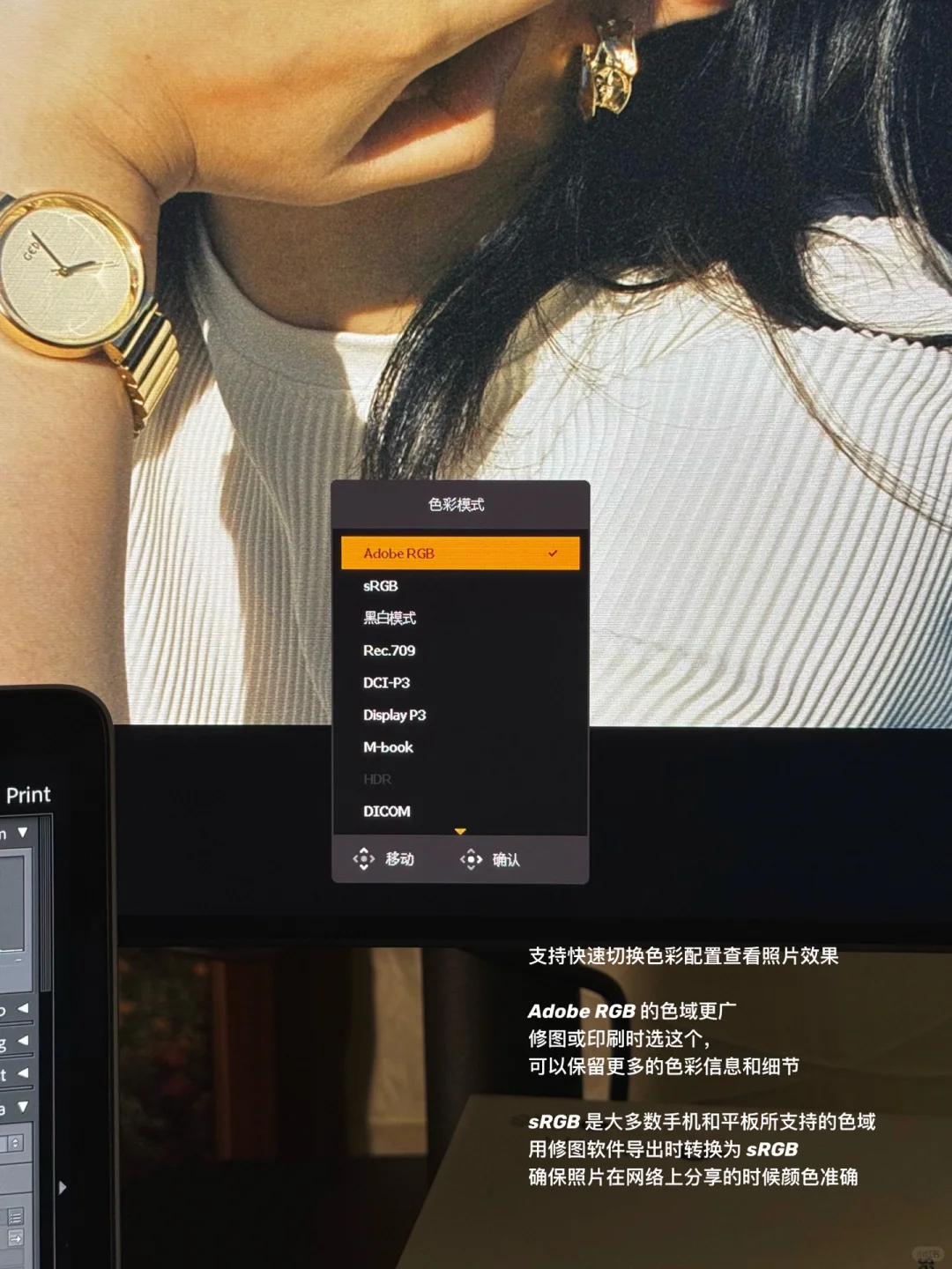 3️⃣ 广色域随意切换,多种色域的支持使得显示器对色彩的还原更加真实。很多人可能会忽略色彩配置的重要性,但对于专业修图来说,这是一个关键因素。明基 SW242Q 确保画面有更准确的饱和度和亮暗部细节,每每在屏幕中看到色彩层次丰富的照片时,那些旅行回忆就又鲜活起来了。