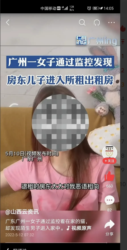 房东儿子偷进女租客卧室?”广东广州,一名年轻女子租了套房子,在里面安装了监控。近日,女子到外地出差期间,通过监控看自己养的猫,意外发现房东儿子进了自己的卧室,而且听到“嘀”的一声,疑似刷卡进入房间。房东儿子在卧室里呆了4分钟才出来,而且手中拿着一个白色物体,不知是何物。之后,房东儿子还又进入房间一次。事后,房东儿子坚决否认“嘀”过卡,说是看到门没关紧,检查了一下。女子报警后,警方说没有办法,房东儿子当时正在管理这栋楼。经过警方协调,房东与女子协商退租,并免除女子一个月的房租。但是没想到女子退租时,遭到房东太太的破口大骂,说她骗自己的钱。(信息来源:star星视频)