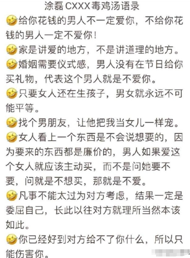 而近日,涂磊又遭人举报称私生活混乱,但广大网友却劝涂磊大度,又是怎么一回事呢?事情还要从涂磊开始进入短视频领域说起。 在抖音短视频中,涂磊总是板着脸,用着低沉的男中音说着一些“鸡汤”: “给你花钱的男人不一定爱你,不给你花钱的男人一定不爱你!” “女人看上一个东西是不会说想要的,因为要来的东西都是廉价的,男人如果爱这个女人就应该主动买,而不是问她要不要,问就是不想买,那就是不爱。” “女人有时候会不讲理,但家庭不是讲理的地方,男人要大度一点!” 从这些言论可以看出,涂磊在对待男女关系上,希望男人可以多吃亏,多付出。 而男人在多付出后是否能够得到对方的理解和回报,涂磊没有明确指出,反而是一直鼓吹“男女关系中,男人不可能得到平等对待。” 于是,便有一部分网友指出,涂磊在炒作“男女对立”的流量。 涂磊频频迎合女人,贬低男人的行为不仅遭到男性网友的指责,连女性网友也觉得涂磊太过油腻。 这不,近日举报涂磊私生活混乱的网友身份,正是抖音上的一名女博主。 此事经过发酵后,涂磊遭受到了一部分网友的指责,而他本人回应已经报警后,曾对涂磊“贬男扬女”言论不满的网友,才会站出来嘲讽他大度一点。 目前,涂磊还尚未回应惨遭嘲讽一事,但有网友猜测,涂磊估计以后估计再也不炒作“男女对立”的流量了。 对此,你觉得涂磊说的对,还是真的在“男女对立”的流量?