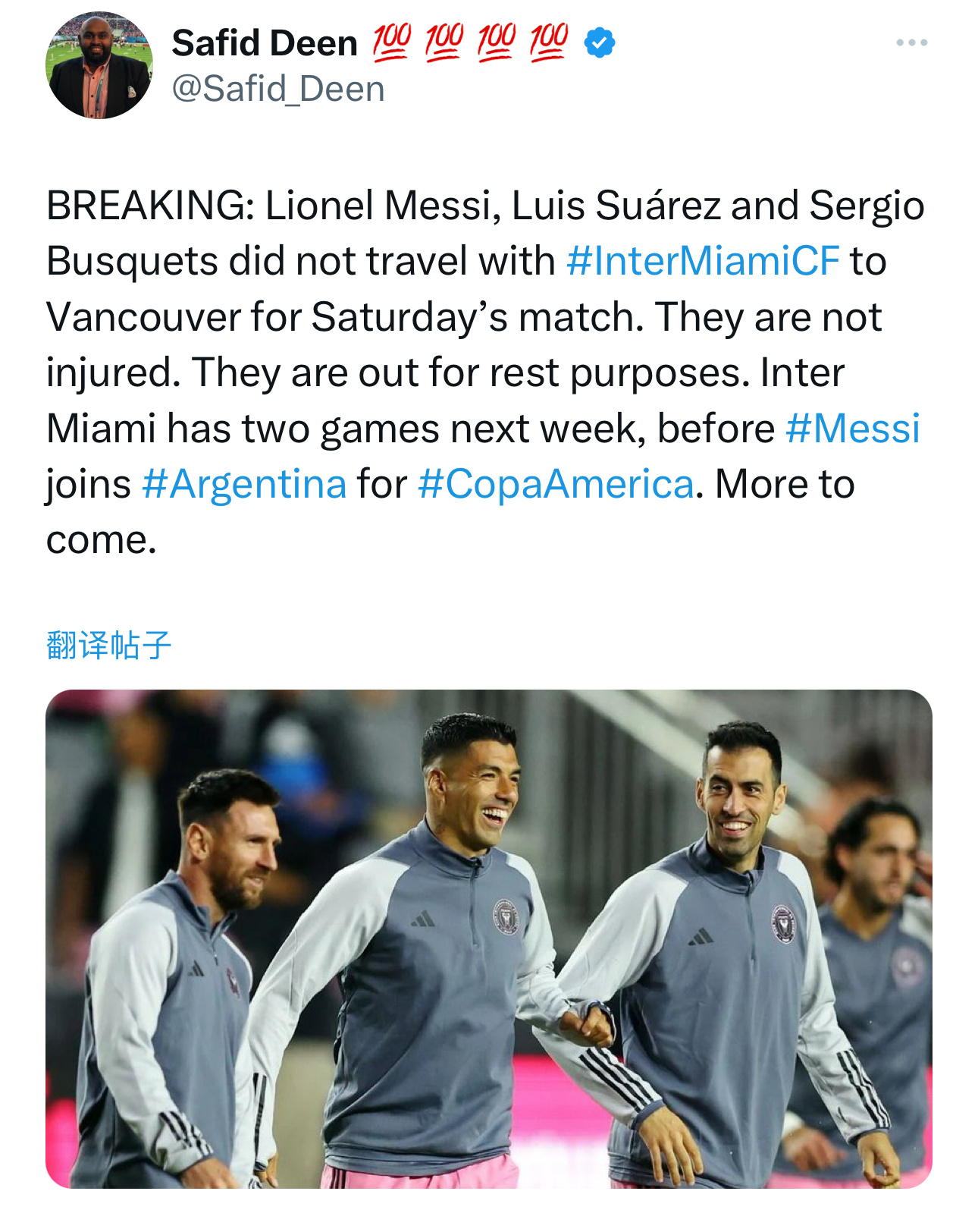 最新消息:莱昂内尔·梅西、路易斯·苏亚雷斯和塞尔吉奥·布斯克茨没有随迈阿密国际前往温哥华参加周末的比赛。他们并没有受伤,只是休息。迈阿密国际下周有两场比赛,之后梅西将随阿根廷队参加美洲杯。