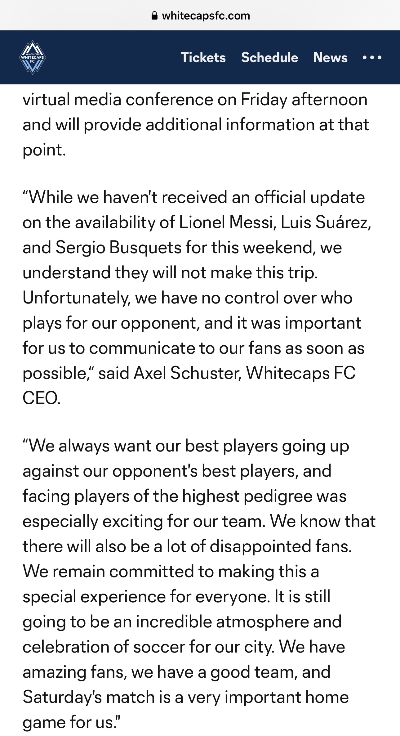 温哥华白浪俱乐部CEO舒斯特也确认,梅西、苏亚雷斯、布斯克茨不会随迈阿密出征,将缺席这场比赛,预计将有55000名球迷现场观看这场比赛: