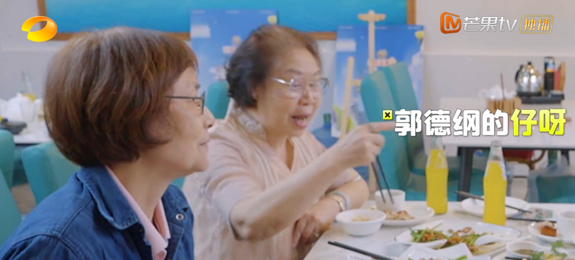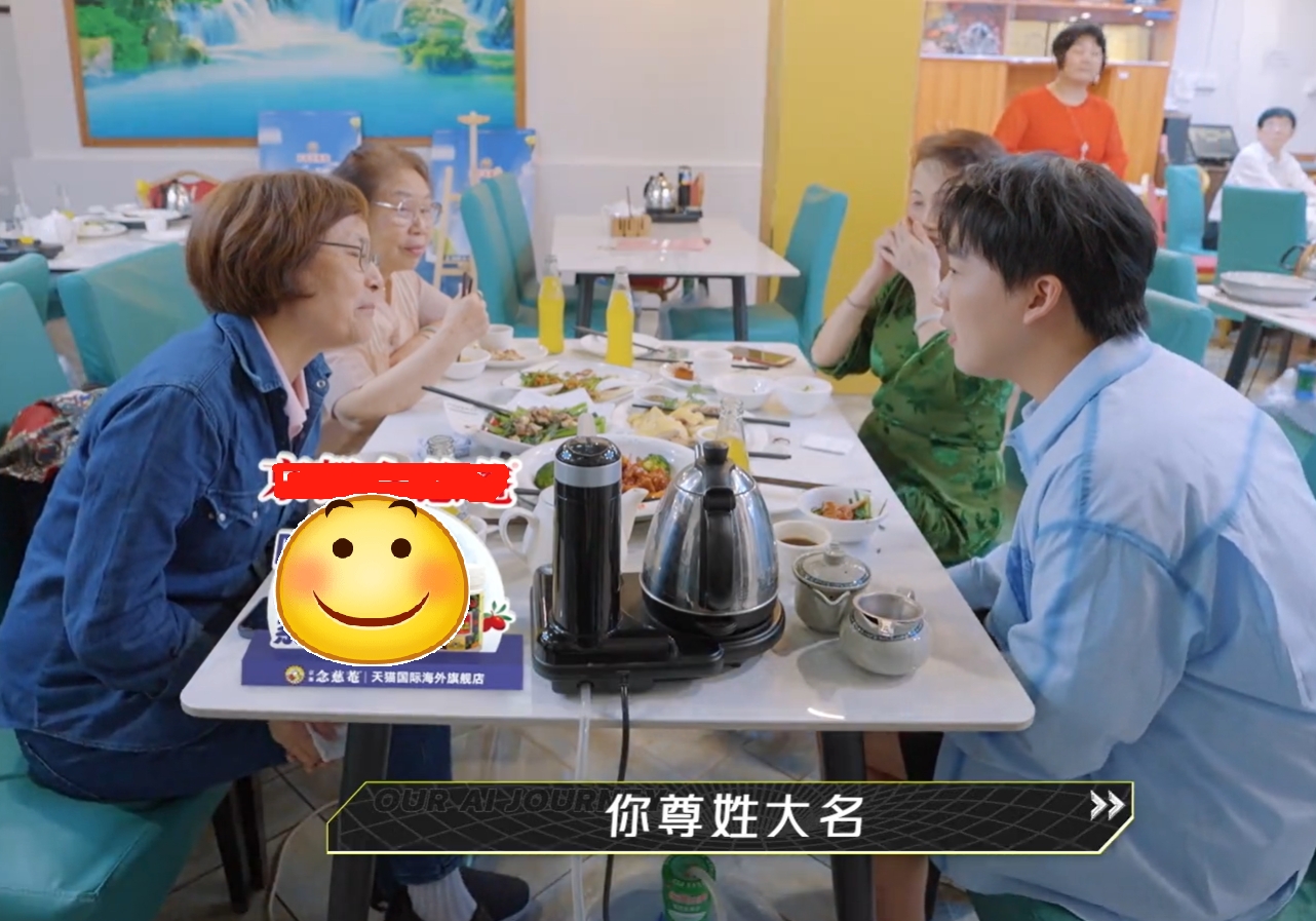 郭麒麟在广州吃早茶,向同桌的3位老阿姨请教粤语,因为有摄像机在跟拍,阿姨问他:“你尊姓大名?”