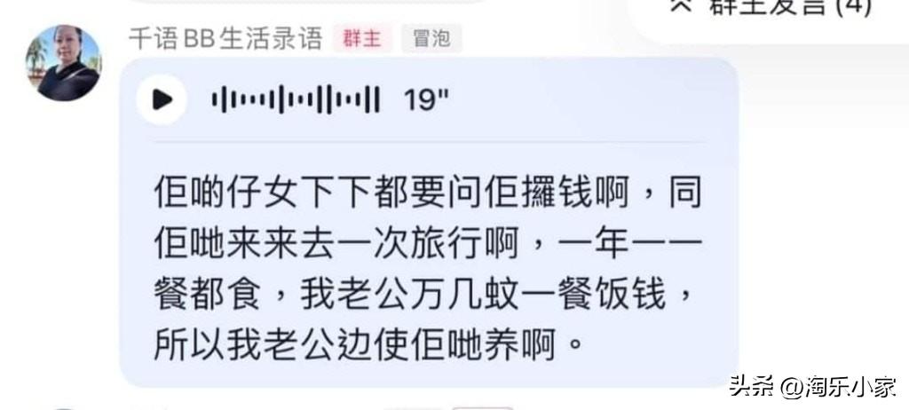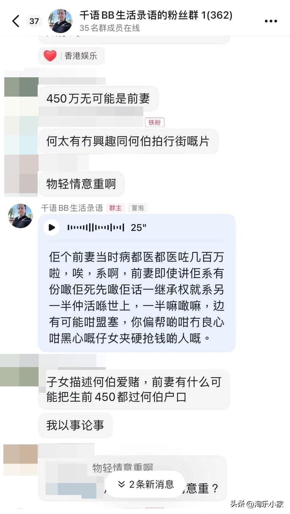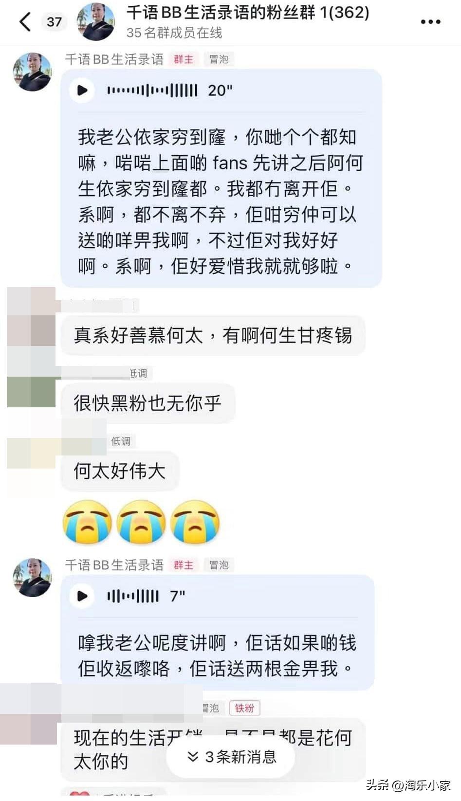 新何太爆家事不满何伯被家人当提款机 爆已故何太花数百万医药费 早前《东张西望》连续报道76岁何伯闪婚细46岁内地女的忘年恋故事,何伯与太太新婚不久後5名仔女亦因此而与他反目,何伯与「新何太」指细女将他的450万养老金全数提走,二仔更将他赶出家中,老先生到医院搵大女时,大女更指要报警。报道一出後,不少网民都热烈讨论他们,两人的行踪和相关消息连日来都备受关注,甚至成为了网络红人,「何伯&何伯老婆关注组」至今已有9.9万成员。最近新何太被发现以「千语BB生活录语」的网名玩抖音,分享自己独有价值观,目前已吸纳了1.9万粉丝,人数持续上升。网民都当是追看连续剧似的追看两人的动向和故事。 昨日 (27/5) 有网民於「何伯&何伯老婆关注组」分享声称是新何太於粉丝群内的言论,当中新何太更大爆不少何家的家事。新何太於粉丝群内与网民聊天时,提到老公何伯经济状况表示:「我老公依家穷到窿,你哋个个都知嘛,啱啱上面啲fans先讲之后阿何生依家穷到窿都(好)。我都冇离开佢。系啊,都不离不弃,佢咁穷仲可以送啲咩畀我啊,不过佢对我好好啊。系啊,佢好爱惜我就够啦。」不过她随即又提到何伯答应会送金给她说:「嗱,我老公呢度讲啊,佢话如果啲钱佢收返嚟咯,佢话送两根金畀我。」 新何太还大爆何伯的仔女以及亲戚都不时花费何伯的积蓄:「佢啲仔女下下都要问佢攞钱啊,同佢哋来去一次旅行啊,一年一餐都食,我老公万几蚊一餐饭钱,所以我老公边使佢哋养啊」、「仲有啊,有时啊,啲大姨仔啊,冇钱交保险费5万蚊噉,我老公惊畀一个又话佢偏心,又每人都5万噉样,我老公信人好好」、「我老公又讲啊,佢大姨仔排牙啊,做咗11万几啊,都系我老公帮佢畀」,字里行间都可以看得出她是在埋怨何伯的家人当何伯是人肉提款机。新何太更指何伯亡妻生前曾花掉数百万作医药费,她表示:「佢个前妻当时病都医咗几百万啦,唉,系啊,前妻即使讲佢系有份噉,佢死先噉佢话一继承权就系另一半仲活喺世上,边有可能咁萌塞,你偏帮啲咁冇良心咁黑心嘅仔女夹硬抢钱啲人嘅。」