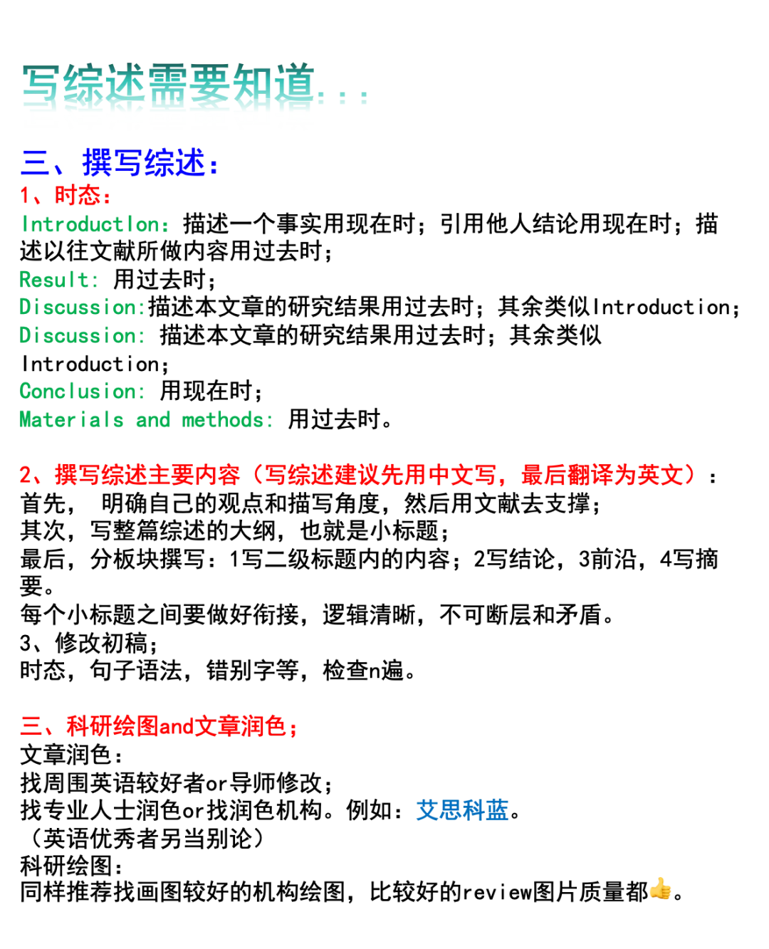 近期在写综述,总结出一些实用的写综述的方法和技巧,分享给大家~具体内容展示在图2图3… 👉🏻这里着重想强调几点: ✅1、寻找文献and整理文献时避免遗漏,这是大忌,遗漏会失去客观性; ✅2、追溯文献时要找源头文献; ✅3、看文献时建议先看比较新的相关领域综述3-5篇,先理清楚整个领域的脉络以及可以分为几大块去写; ✅4、寻找这几篇综述中的相同点和不同点,逐一列出。 ✅5、综述中未提到的且有新发表的相关文献,写综述时这部分要加进去; ✅6、综述要有自己的侧重点,不要与以往综述相同;着重注意以往文献and综述里自己确定的侧重点,并且做好标注。 ✅7、看综述和搜集文献同时进行。 👉🏻综述的时态问题: 🕸️introduction:描述一个fact用现在时;引用他人结论用现在时;描述以往文献内容用过去时; 🕸️result: 用过去时; 🕸️discussion: 描述本文章的研究结果用过去时;其余类似introduction; 🕸️conclusion: 用现在时; 🕸️materials and methods: 用过去时。 👉🏻科研绘图(综述重点之一): 好的review的绘图水平肯定是👍的,自己画图能力一般的话建议找zhuan业相关人员绘图。 👉🏻文章润色: (英语较好者另当别论) 找周围英语较好者or导师修改;也可以润色老师或者机构润色,例如:艾思科蓝‼️ ➡️艾思科蓝功能比较多样化,从文章初稿到选刊到投稿到接收,一条龙都有对应的板块; ➡️除了文章润色之外,还提供科研绘图相关的资料; ➡️综述发表过程中,不免要纠结选刊的问题,艾思科蓝可🆓查各专业不同类的杂志,帮助我们投稿(如图所示); ➡️除此之外,学术小白在这里可了解到前沿会议的情况,直接🔍某地点近期的学术会议,即可投稿参会啦,对研究生来说算是比较福音的‼️🥸
