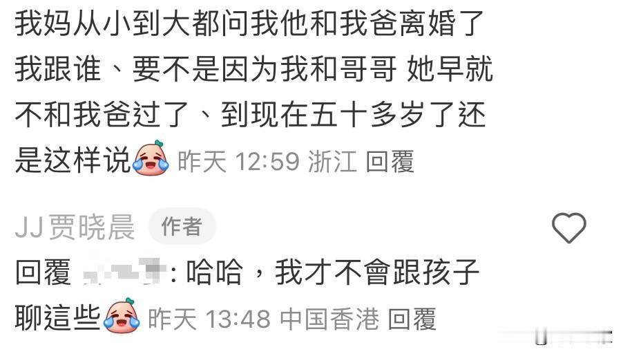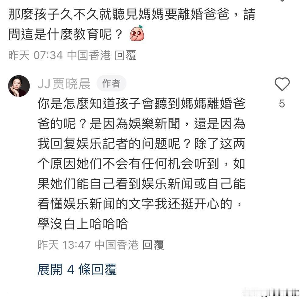 41岁《美女厨房》冠军狂讲离婚数老公 被嘲唔识教两个女公开反击 现年41岁的贾晓晨(JJ)早年参加《美女厨房》成为「美少女厨神冠军」,其後在《味分高下》中担任「味之天使」入屋。贾晓晨与樊少皇婚後育有两名女儿「小饭兜」和「小饭团」。不过近年贾晓晨多次在微博发文诉苦,斥老公无情趣,又想离家出走,「一日要谂50次离婚!」她近日又爆樊少皇沦提款机被友人骗数百万,已将樊少皇「降格」为保镖。 近日贾晓晨与老公已和好如初,一家四口外出享受亲子时光。贾晓晨分享教育心得,指最希望小朋友健康同开心,又会带两名爱女到外面走走「接受社会教育」,扩阔眼界。 有网民窒贾晓晨「那麽孩子久不久就听见妈妈要离婚爸爸,请问这是甚麽教育呢?」贾晓晨反击称:「你是怎麽知道孩子会听到妈妈离婚爸爸的呢?是因为娱乐新闻,还是因为我回覆娱乐记者的问题呢?除了这两个原因她们不会有任何机会听到,如果她们能自己看到娱乐新闻或自己能看懂娱乐新闻的文字我还挺开心的,学没白上哈哈哈」。 有人留言分享指父母由细到大都会讲离婚,贾晓晨坚称不会同女儿谈到离婚话题,「哈哈,我才不会跟孩子聊这些」。