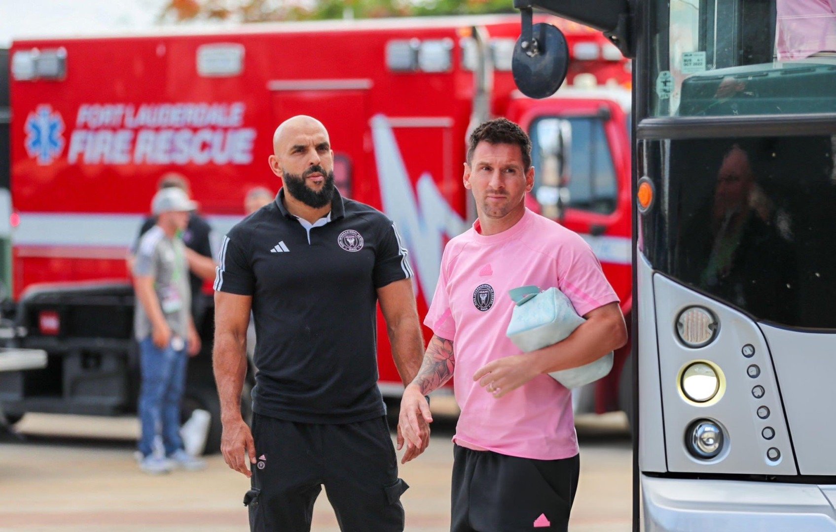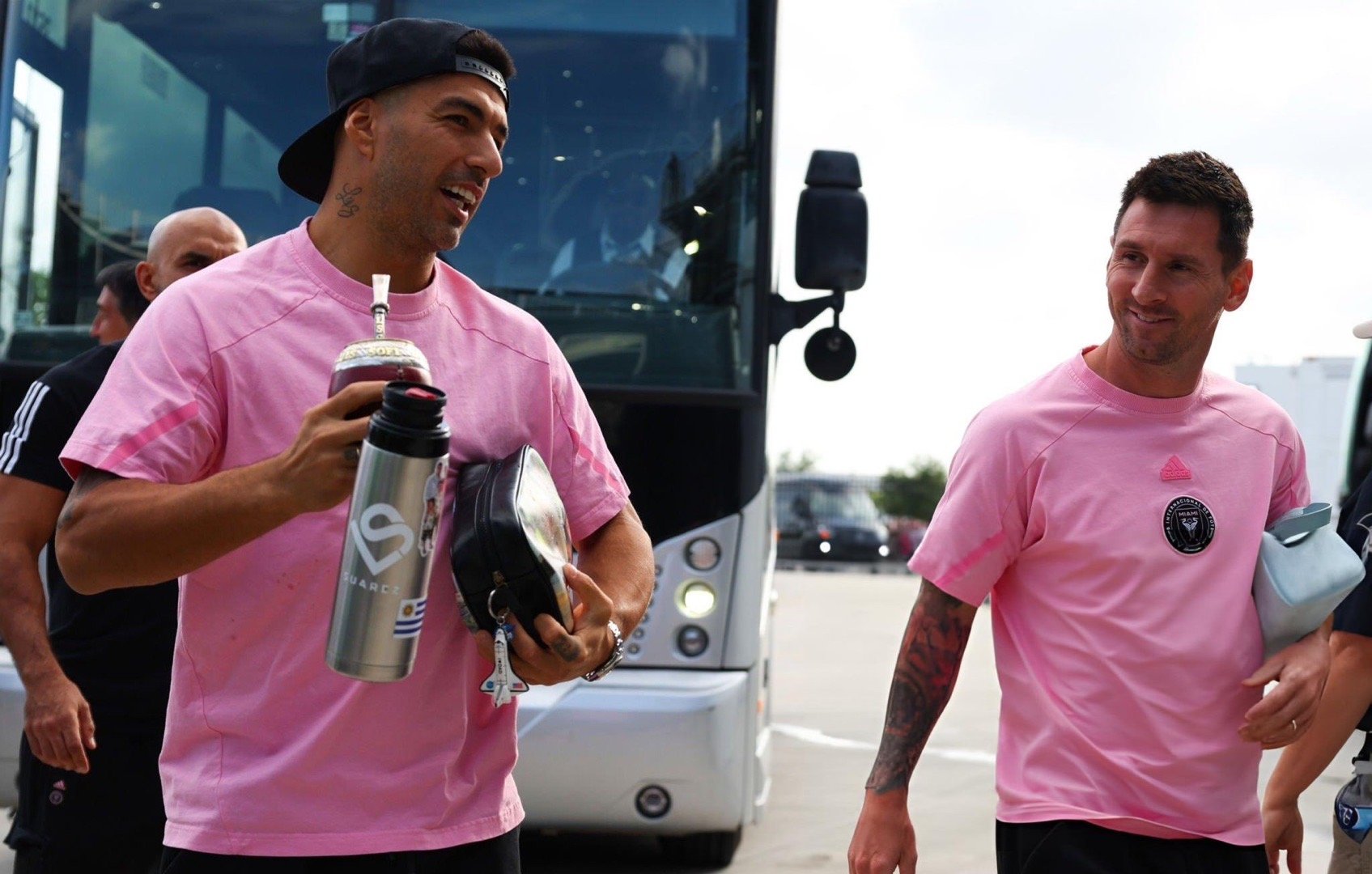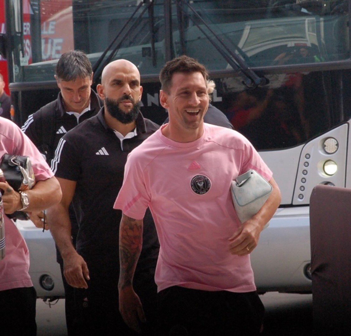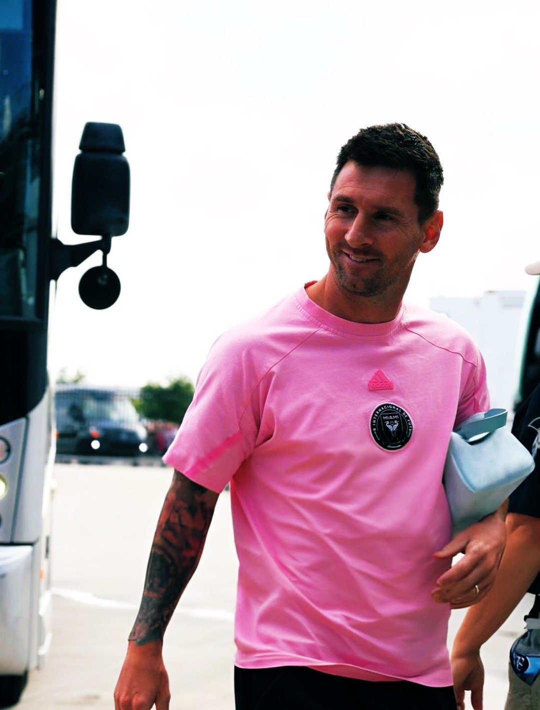 随队抵达球场的梅西!今天是刮胡子小梅[可怜][可怜][可怜]