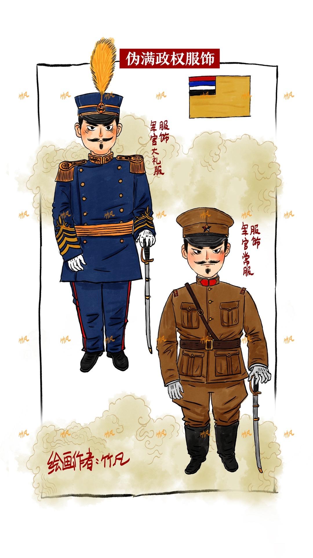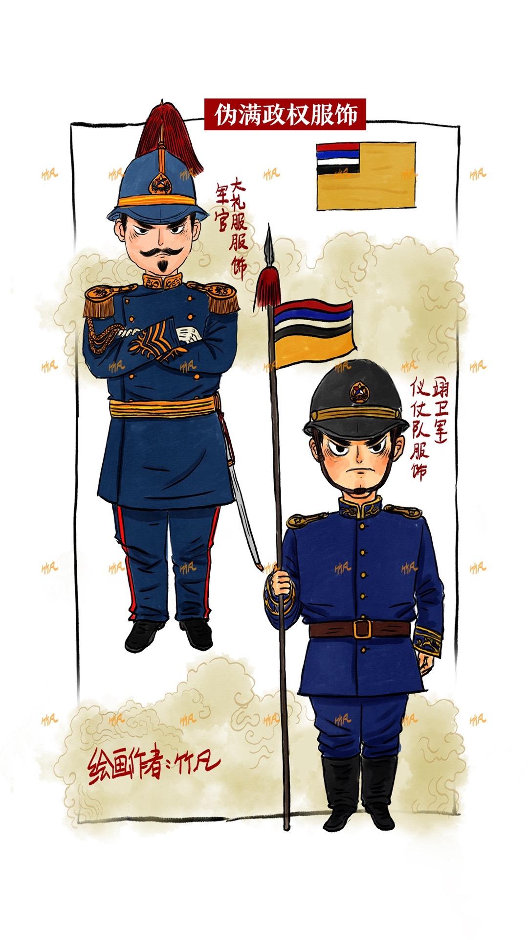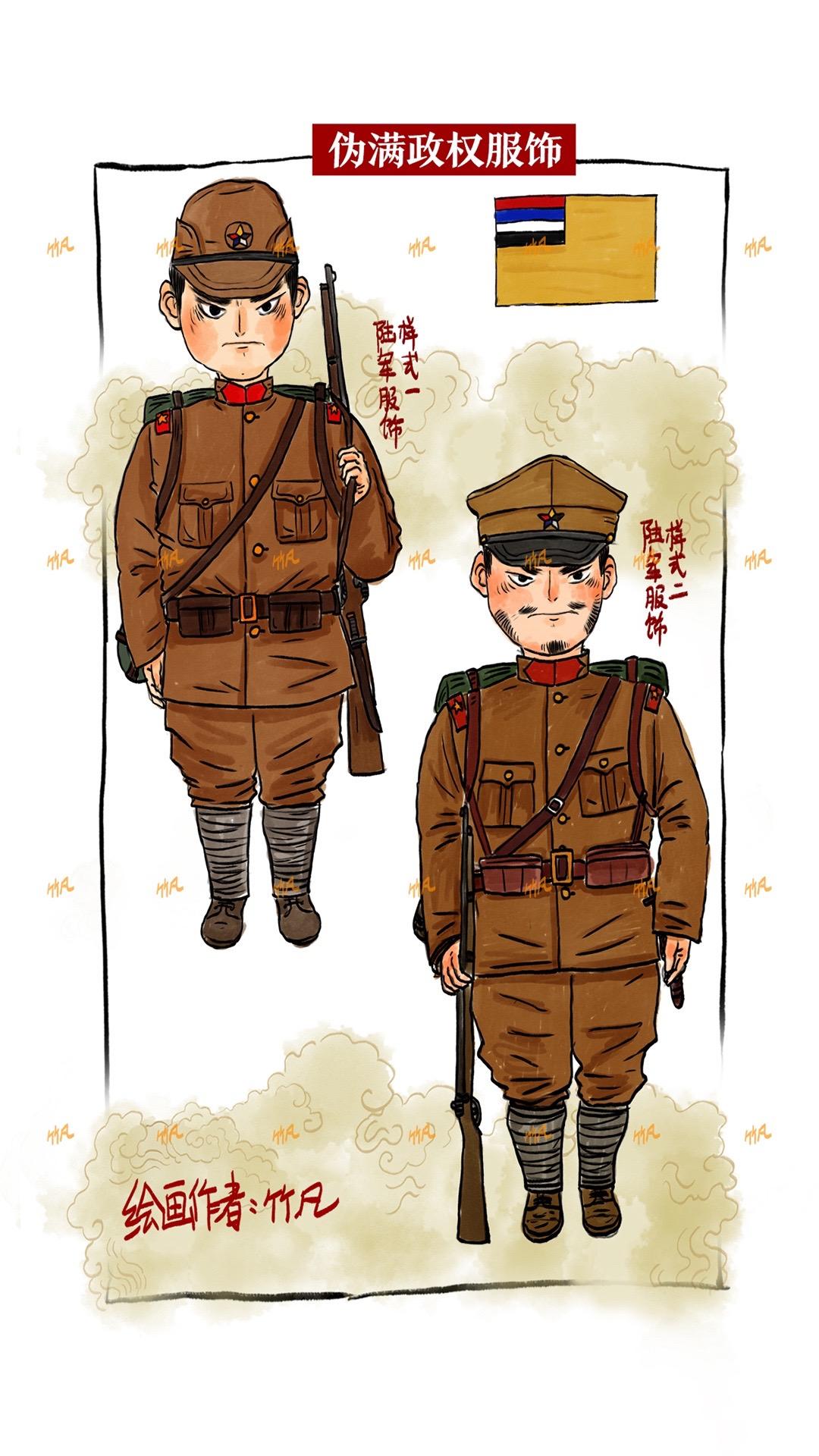 伪满洲政权服饰。伪满洲政权(1932年3月1日—1945年8月18日),自九一八事变后,日本占领中国东北地区,后续扶植溥仪建立亲日伪满洲政权,整体服饰以日军为蓝本,到了后期服饰更替,基本与日军无异。1945年抗战胜利,日本投降,伪满洲政权也随之瓦解,铭记历史!