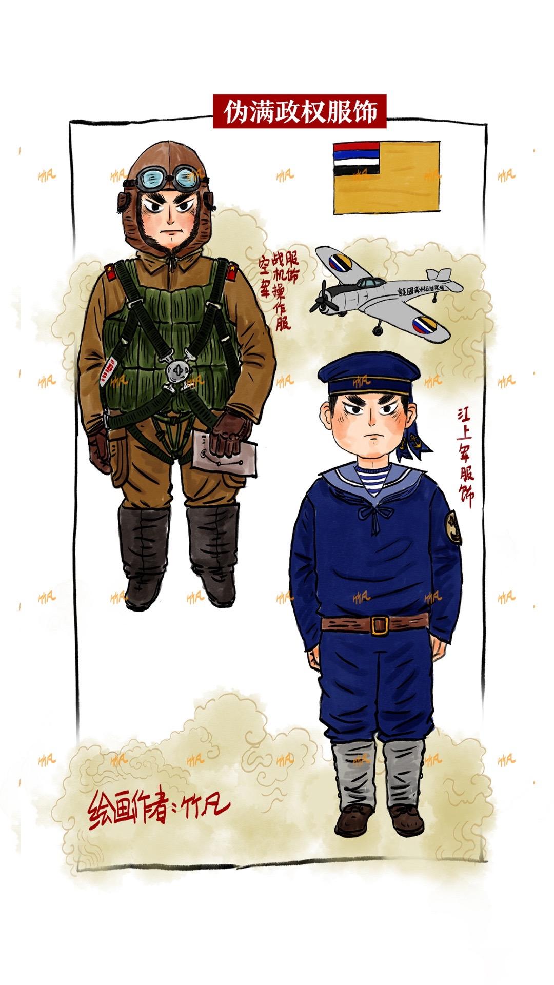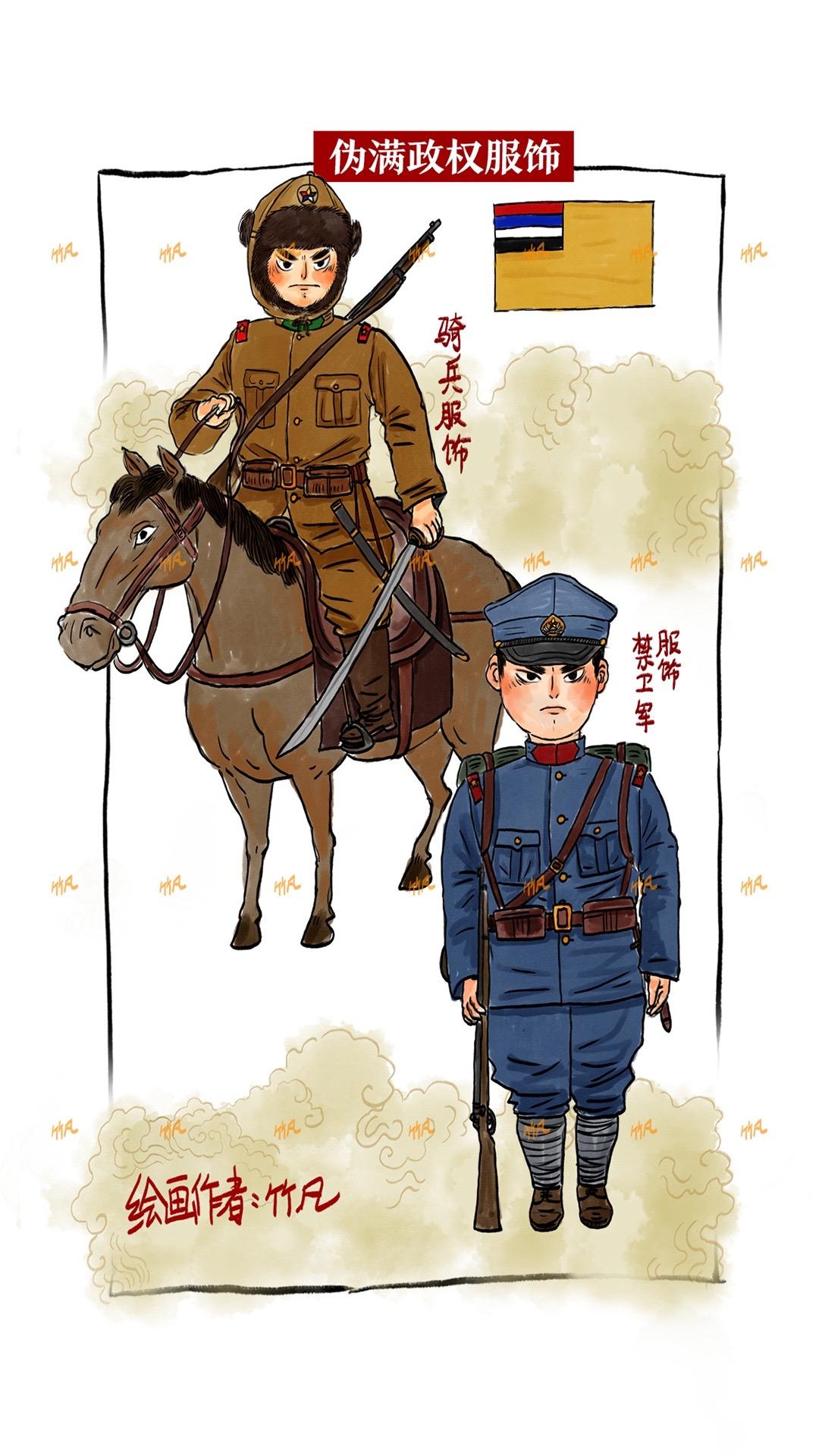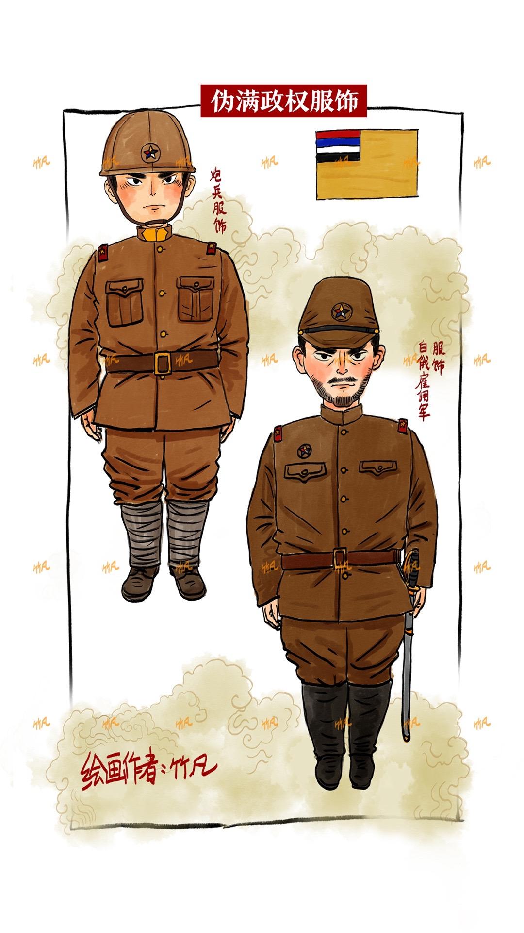 伪满洲政权服饰。伪满洲政权(1932年3月1日—1945年8月18日),自九一八事变后,日本占领中国东北地区,后续扶植溥仪建立亲日伪满洲政权,整体服饰以日军为蓝本,到了后期服饰更替,基本与日军无异。1945年抗战胜利,日本投降,伪满洲政权也随之瓦解,铭记历史!