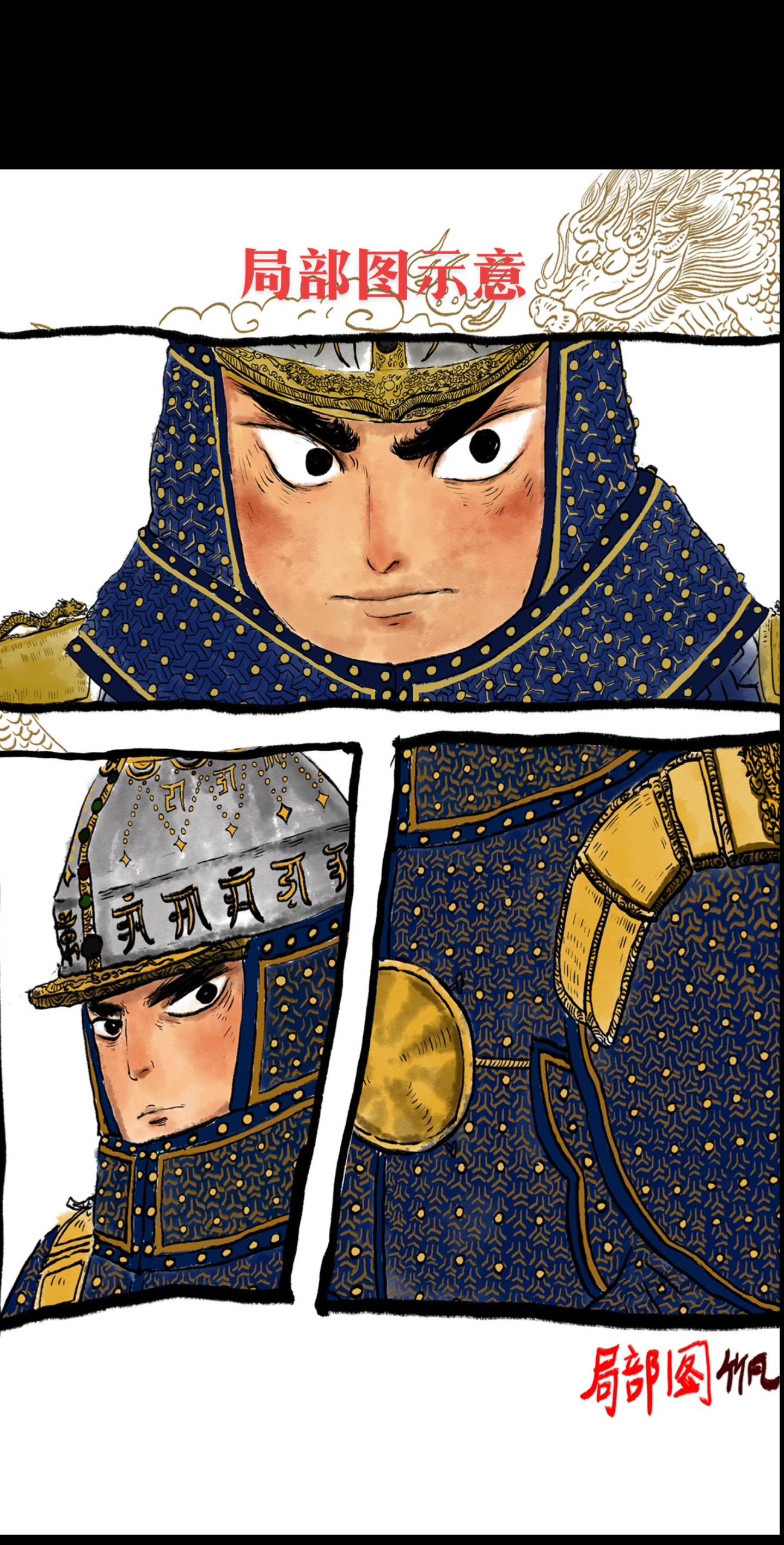 清代亲王棉甲手绘图稿分享。清亲王甲胄(棉甲)花纹为三纹甲样式底部为石青锦布,上部嵌入铆钉连接,肩部护甲有浮雕龙纹样式,裙甲镶嵌外置金属片。头盔部分镶嵌宝石,并嵌写梵文三层,顶部红绒。整体样式参考《皇朝礼器图式》