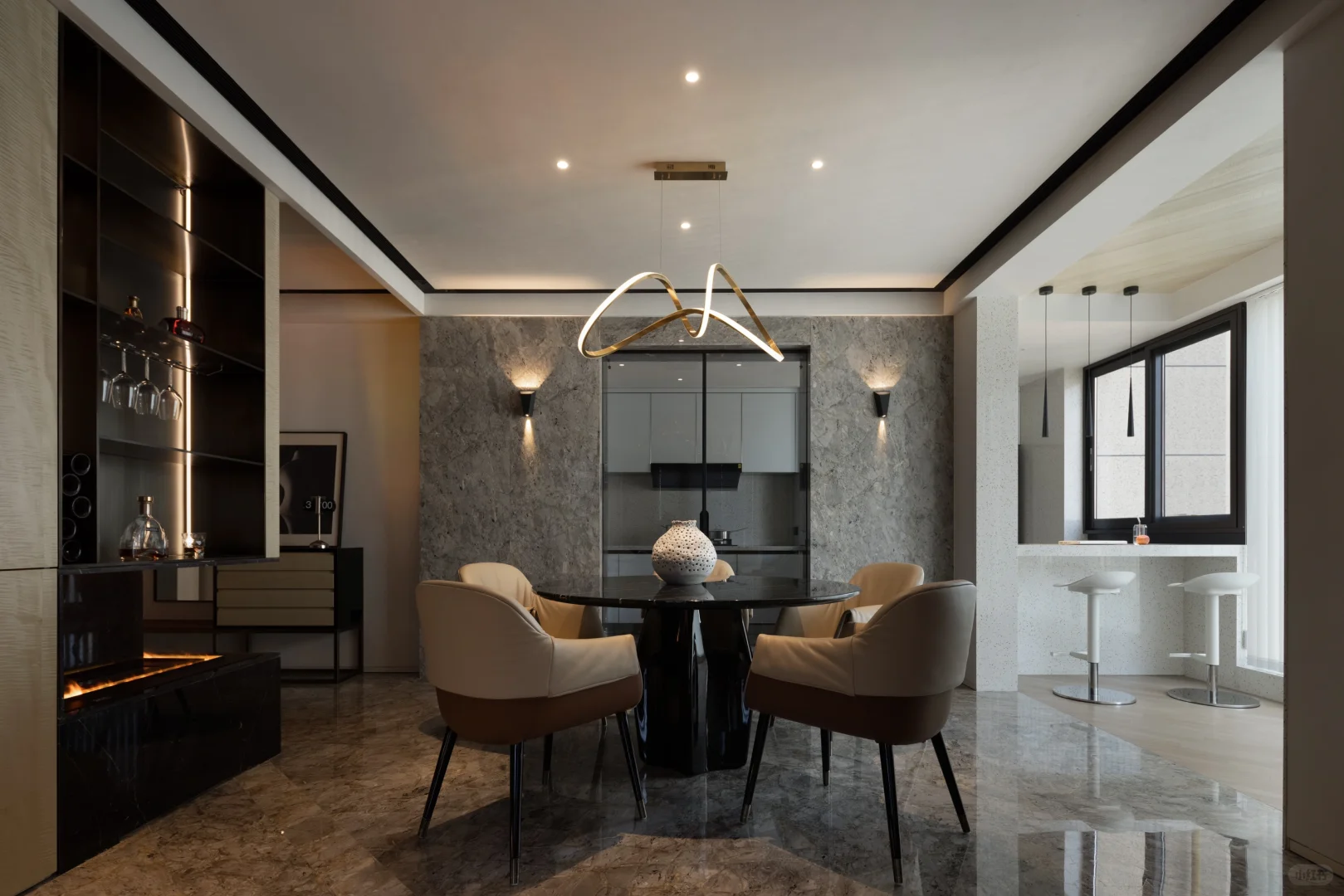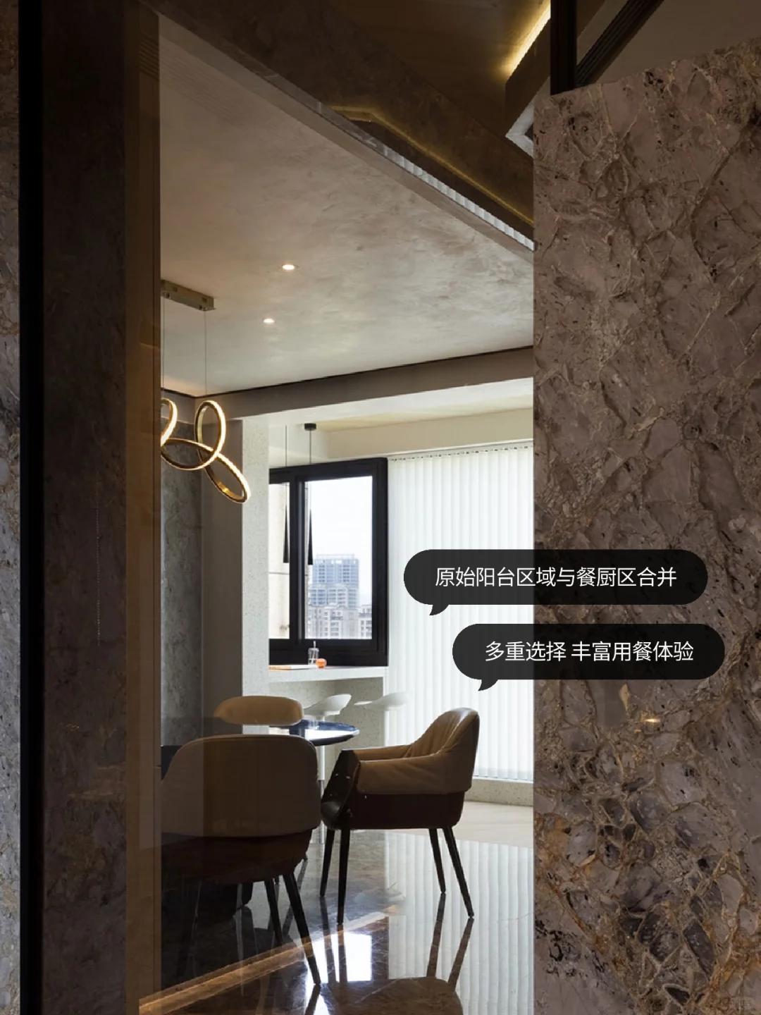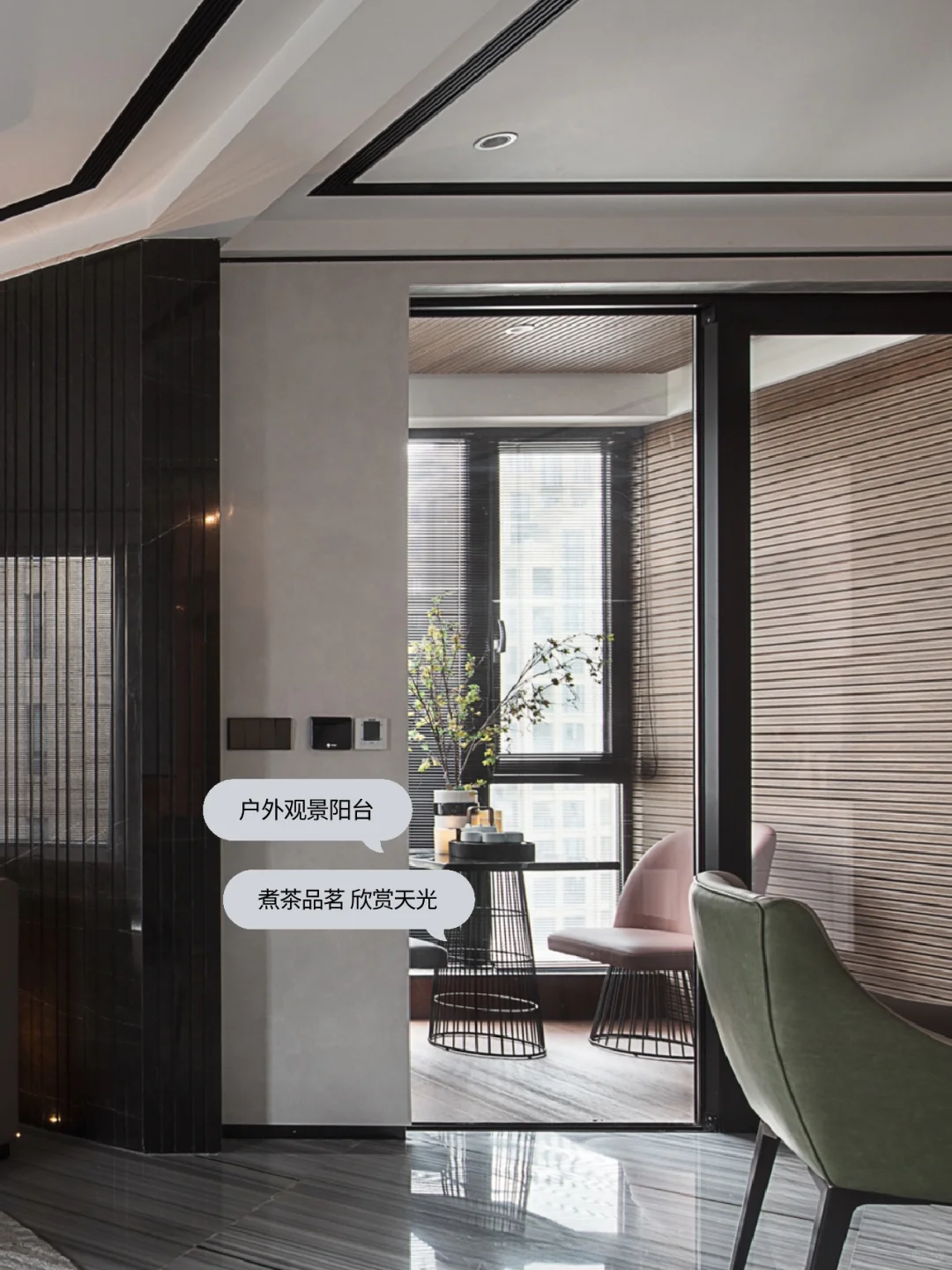 ADDRESS.温州尚品半岛私宅 本次拆解分析尚品半岛小区内相反户型的不同阳台区域设计:同样的留白区域,一是选择全包入室成为吧台,一是选择保留成为户外观景阳台。 选择成为吧台是延续餐厨区的用餐体验,水吧台的设计可小酌可用餐;同时用同色系岩板平铺桌面,增加家中空间。选择留存户外阳台则是本着“闲情逸致”的高雅爱好,总也想呼吸着钢筋水泥窗户外的空气,观赏着楼下车来车往的人群。 不同的家居设计,往往对应着不同的生活选项。一千个人眼中有一千个哈姆雷特,尽管是相同户型,也有完全不一样的设计。