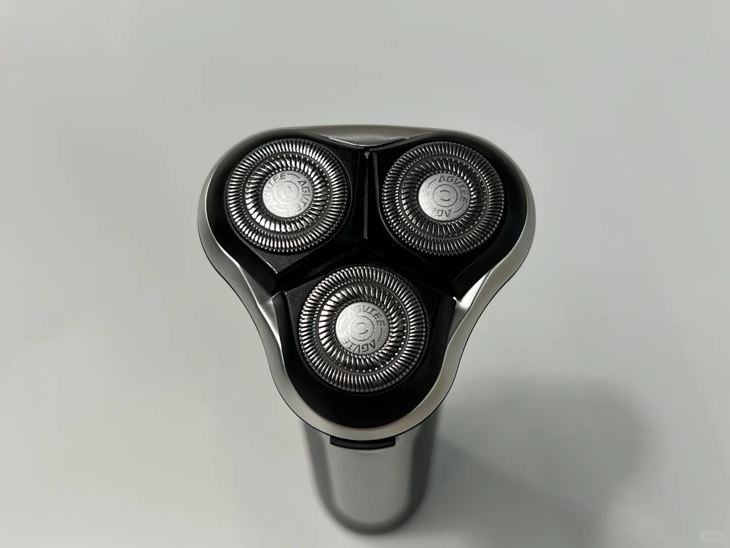 然后就细看这个刀头部分的细节也很丰富,它和我之前使用的剃须刀比起来连构造都不一样,未野剃须刀MAX的三个刀头是采用双层15组德国进口不锈钢的自研磨刀片,双环弧面刀网设计,并且它的结构是三重浮动,而我之前所使用的都只有一层浮动刀头,这样就能保证很好的贴合面部,即使是痘痘,下巴拐角,嘴角处也能剃须干净。