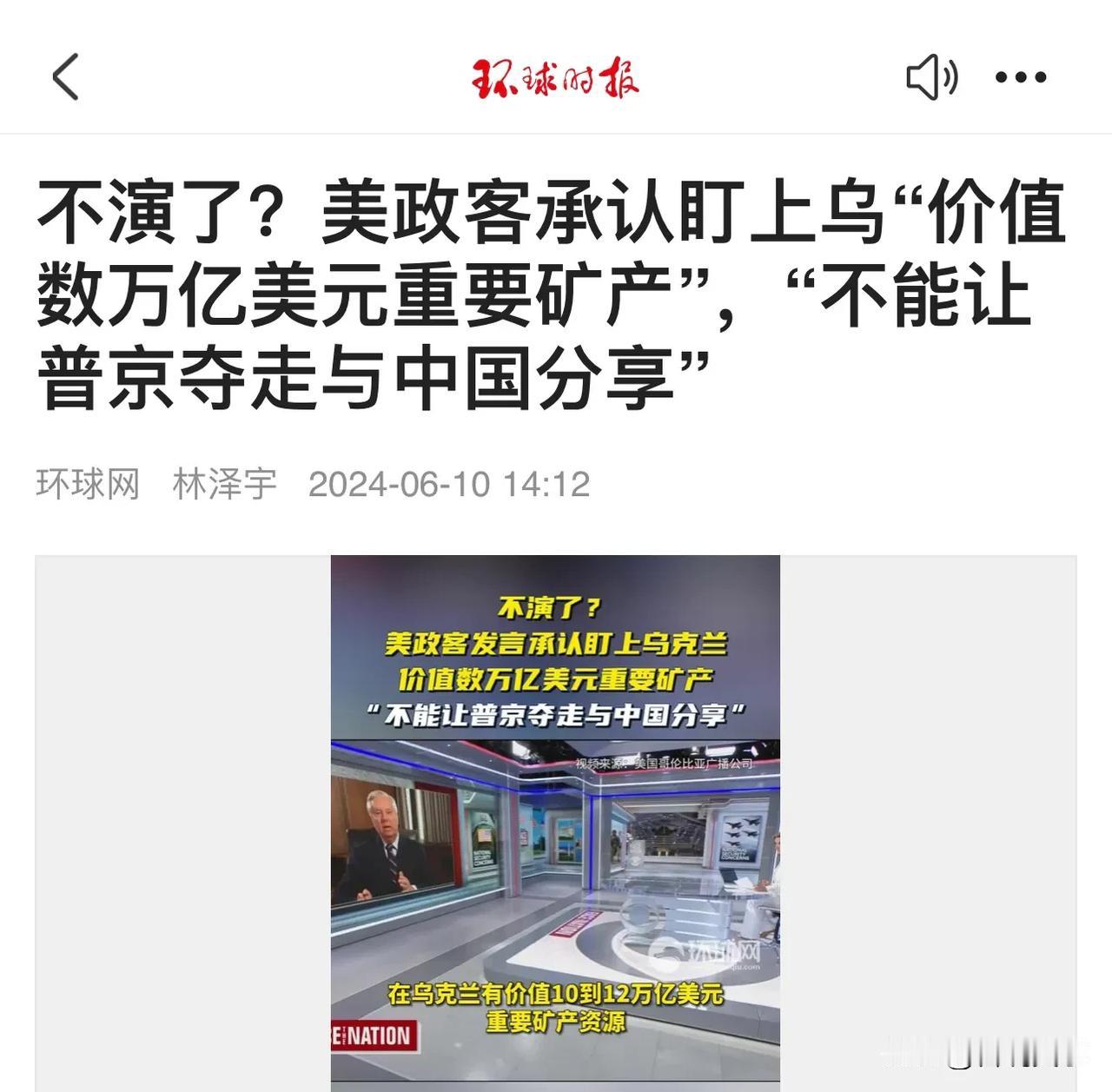 美国的真实目的暴露了! 就在昨天!据环球网报道,6月9日美国共和党议员林赛 格雷厄姆在一档节目里声称,乌克兰可能成为全球最富有的国家,因为他们拥有价值近12万亿美元的矿产。 格雷厄姆在节目中强调,如果我们帮助乌克兰,就能和他们一起开发这些矿产。而不是把这些资源交给俄罗斯,让他同中国来分享。 有评论表示,原来如此!美国是盯上了乌克兰丰富的矿产资源,难怪不遗余力的怂恿西方国家支持这场冲突,等到乌克兰打烂就去捡便宜吧 也是,美国强盗做习惯了,总拿同样的眼光看待别人。普京多次强调愿意同乌克兰和谈,同时表明无意占领基辅。