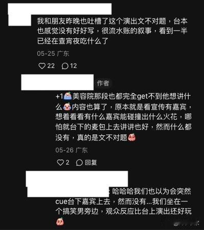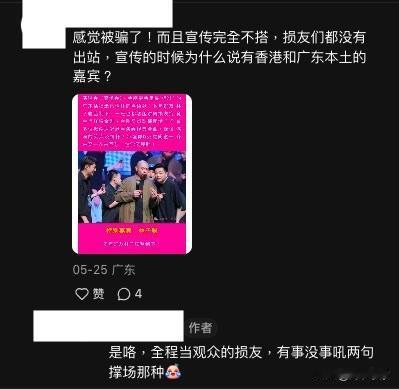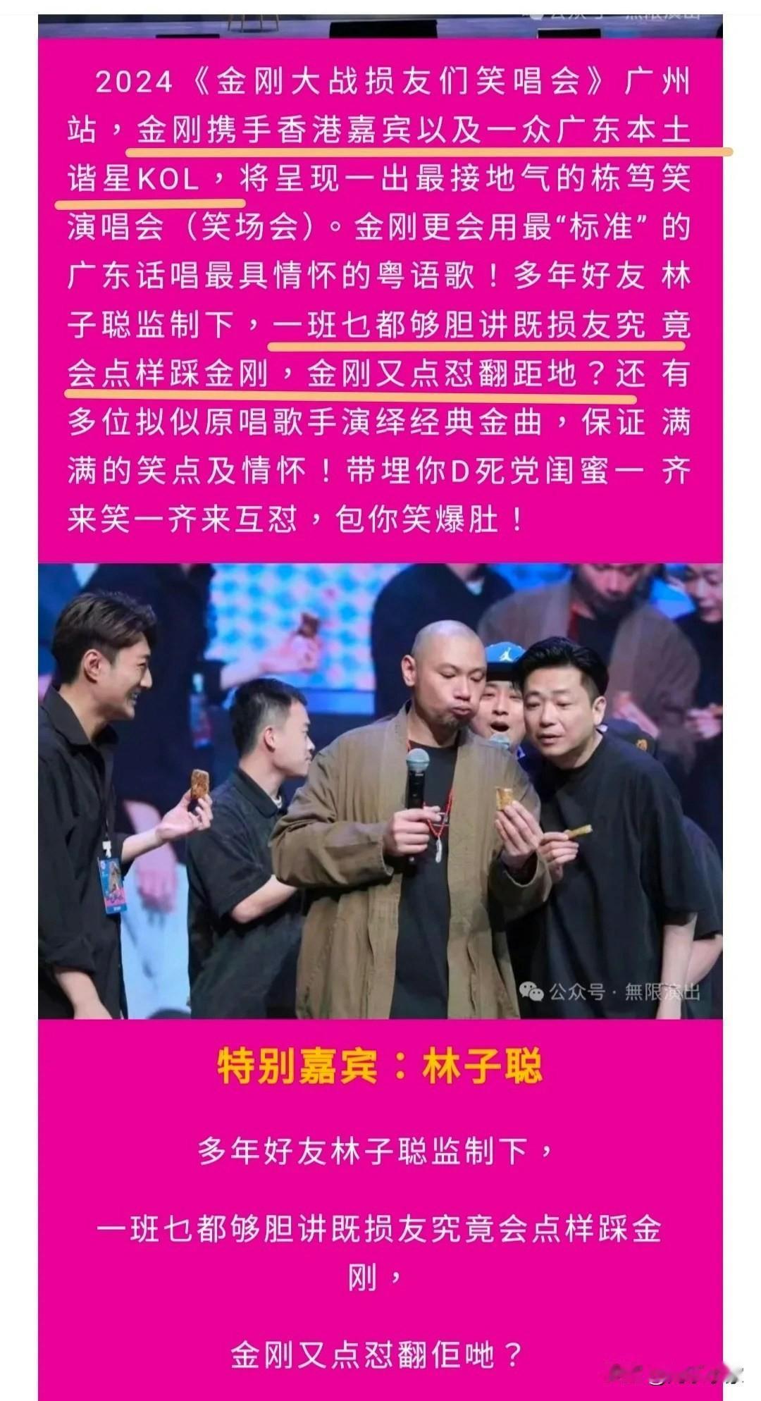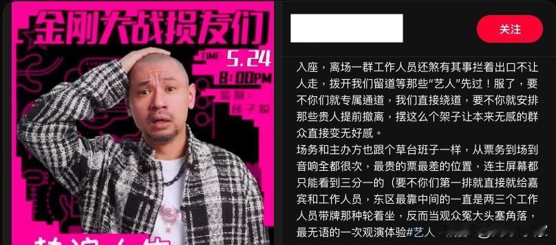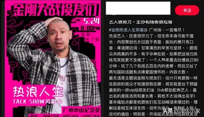 💖金刚内地开唱笑会观众骚后大吐苦水感被骗:最无语的一次观演体验 💖金刚近年长驻内地发展,作多方面尝试,上月他更在广州中山纪念堂举行《热浪人生笑唱会之金刚大战损友们》,肥仔聪林子聪除了担任笑唱会监制外,还身兼特别嘉宾上台演出,可以说认真够兄弟。然而,栋笃笑好笑与否其实很主观,没有特定的标准,但其中有位观众看完却非常生气,在社交网撰长文「观后感」,表达其心中的不满。 💖该博主并没有抹煞金刚的努力,不过就直斥主办和场务很垃圾:「广州场,一言难尽!先说艺人,还是很尽力了,但无奈本身可能不擅长,内容策划也太过趋于表面,能玩的梗只有口音,粤语擦边词,甘草演员的辛苦与坚持。 跟观众共鸣真的不多,有子华神在前,如果把这场归类栋笃笑就更不及格了,一个人翻来覆去吐槽自己90分钟,玩了几个包括五百在内的老梗,然后又扯了两句国际话题有点捧爱国情怀的,内容太散。」 💖另外,博主不满的是宣传时所说的「损友们」,都没有站台,只是有事没事吼两句撑场那种,离开时还要让路给他们:「最无语是主题说金刚与损友们,估计只有跟我一样在前排的观众才知道损友在哪,其实就是台下预留最前的一排vip给损友们坐(tvb那些配角艺人,最出名的是陈浩民和麦长青,其他不太说得出名字)基本尴尬点都是他跟他们在互动喊话来撑过的,理解这是相互体谅支持,但作为观众,有种乱入别人派对的尴尬,特别是,开场延迟是因为这群损友没入座,离场一群工作人员还煞有其事拦着出口不让人走,拨开我们留道等那些『艺人』先过!服了,要不要你们就专属通道,我们直接绕道,不然你就安排那些贵人提前撤离,摆这么个架子让本来无感的群众直接变无好感。」 💖最后博主形容场务和主办方像「草台班子」一样,「从票务到场到音响全都很次,最贵的票最差的位置,连主屏幕都只能看到三分一的(要不你们第一排就直接就给嘉宾和工作人员,东区最靠中间的一直是两三个工作人员带牌那种轮着坐,反而当观众冤大头塞角落,最无语的一次观演体验。」 💖有网友身同感受,回复博主:「感觉被骗了!而且宣传完全不搭,损友们都没有出站,宣传的时候为什么说有香港和广东本土的嘉宾?」、「我和朋友昨晚也吐槽了这个演出文不对题,台本也觉得没有好好写,很流水账的叙事,看到一半已经在查宵夜吃什么了。」看来大家都看到一肚气。