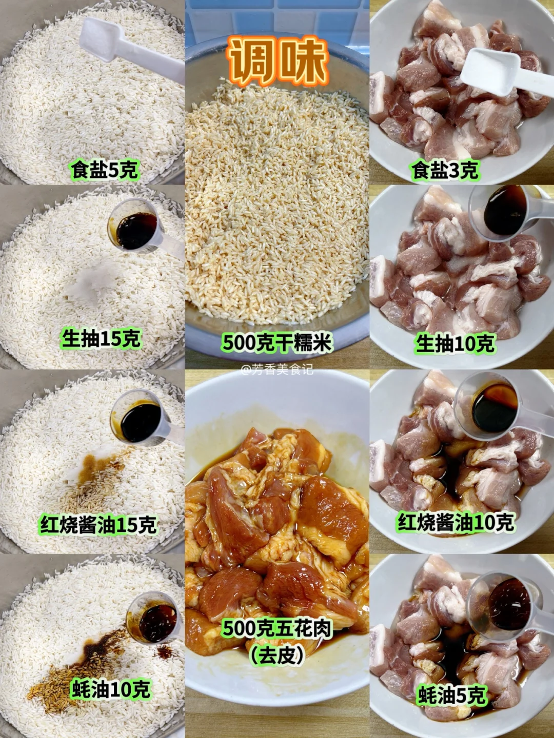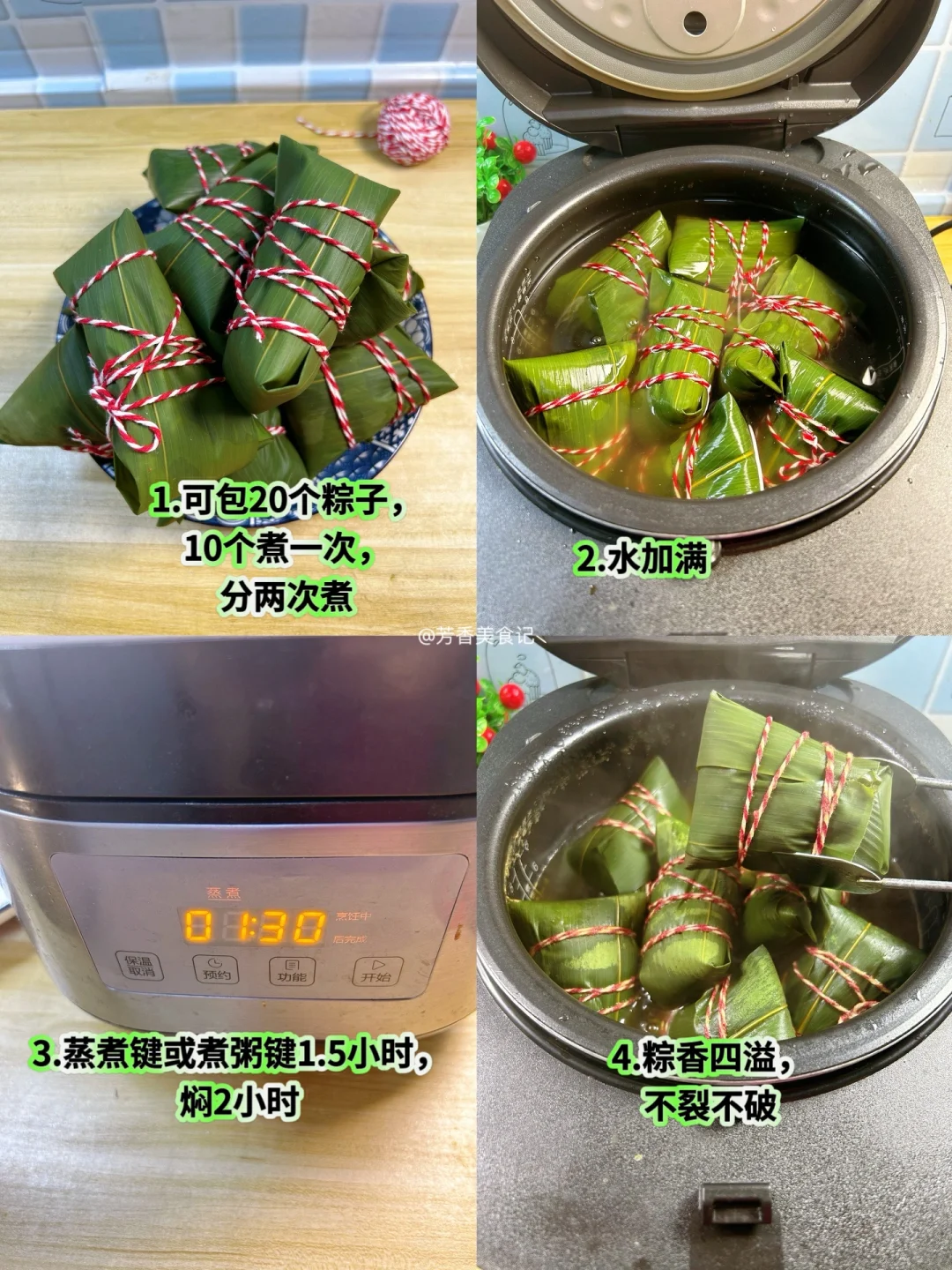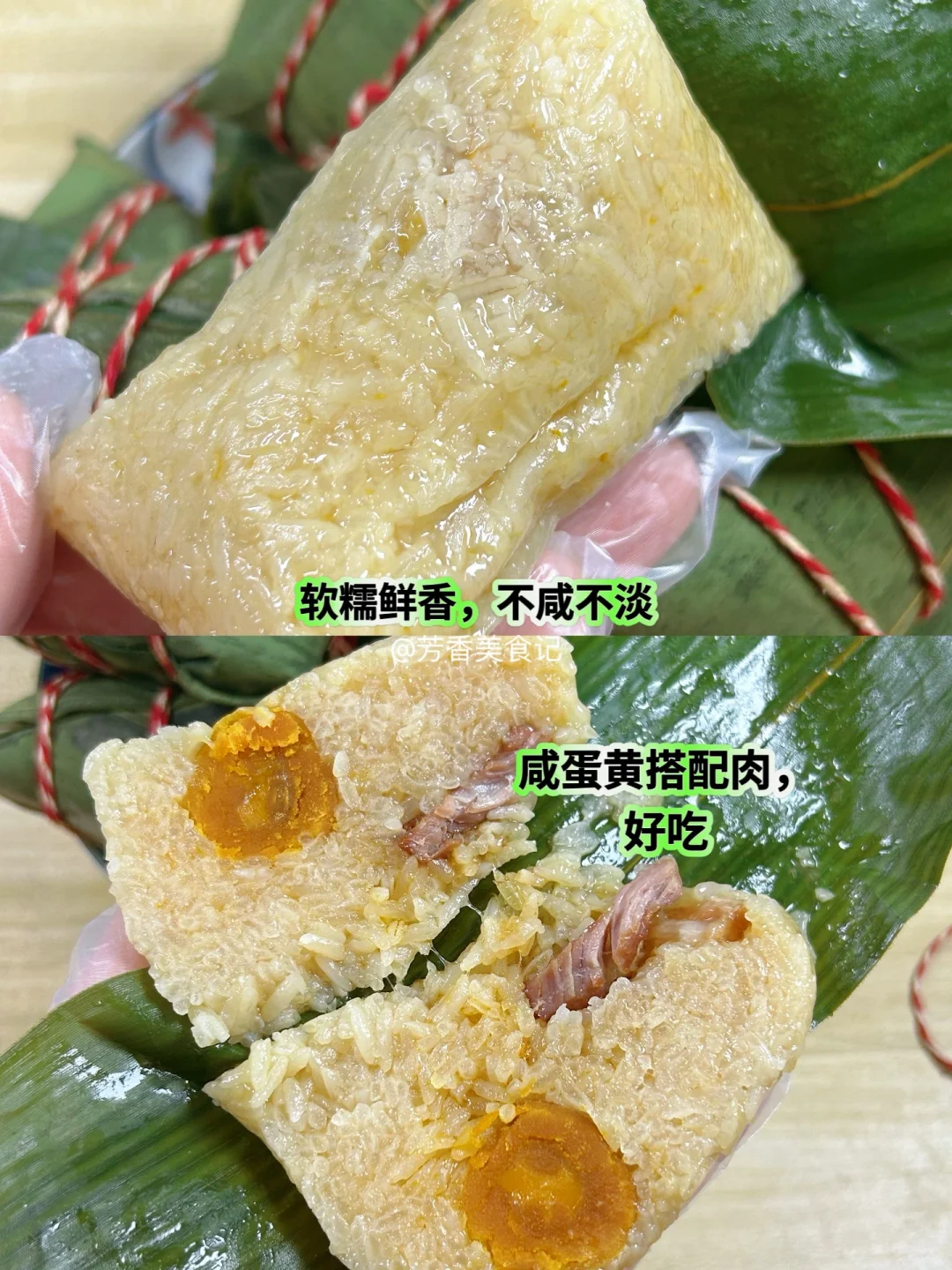 食材:糯米500克,五花肉500克,咸蛋黄20枚,粽叶40片。 调料:食盐,生抽,酱油,蚝油。 步骤:1.糯米洗净,滤水,加食盐5克,生抽15克,酱油15克,蚝油10克,拌匀,腌半小时,期间拌几次。 2.五花肉去皮,切20份,加食盐3克,生抽10克,酱油10克,蚝油5克,抓拌均匀,腌制20分钟。 3.粽叶加食盐或小苏打煮几分钟,一直泡在冷水里。 4.两片粽叶包一个粽子,方法按自己擅长的包。 5.电饭锅煮1.5小时,焖2小时。 6.冷却后,冷藏放7天,冷冻可保存三个月,吃的时候蒸热透。
