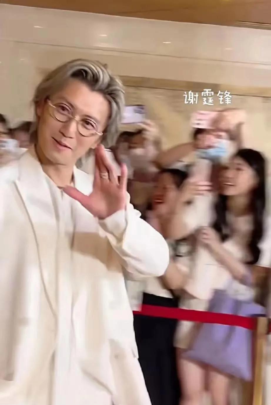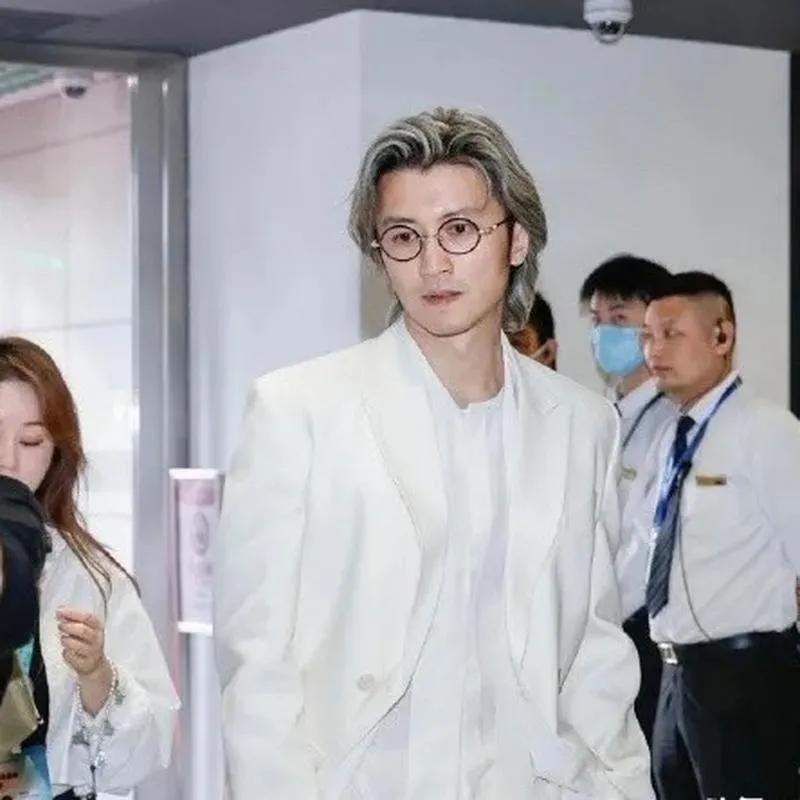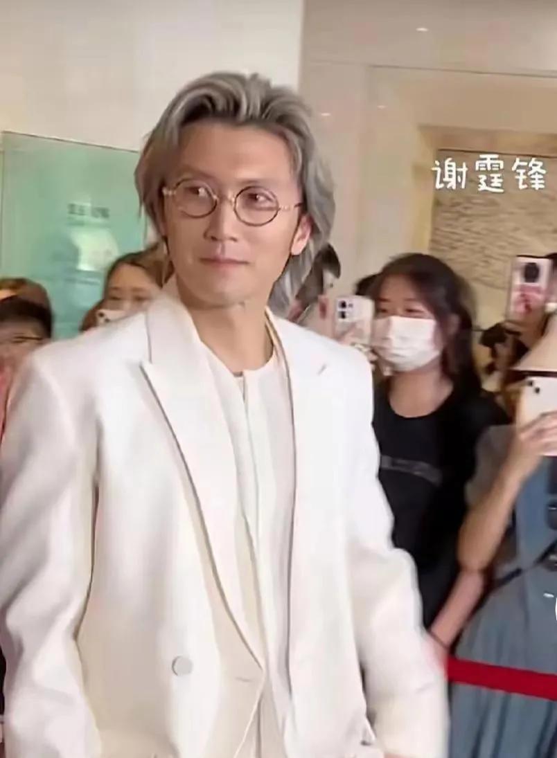 我的天,是真帅啊,跟年轻时候一点不差, 一头银灰发色,戴上圆框眼镜搭配白色西装,