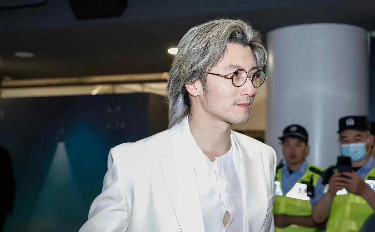 我的天,是真帅啊,跟年轻时候一点不差, 一头银灰发色,戴上圆框眼镜搭配白色西装,造型复古又不失前卫,每一帧都那么帅。