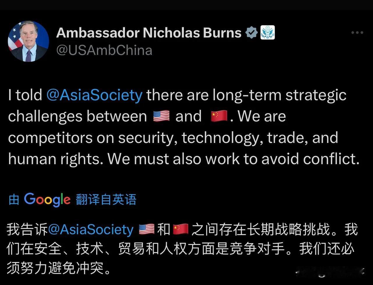 针对中美关系,伯恩斯表态! 就在今天!6月12日,美驻华大使伯恩斯在外媒社交媒体上发文表示,“中国和美国存在长期战略挑战。我们在安全、技术、贸易和人权方面是竞争对手。我们还努力避免冲突。” 只要是正常,不存在偏见与污蔑的竞争,我们都乐意奉陪,中国有句俗语“亲兄弟,还明算账”。 伯恩斯作为中美之间交流的桥梁,应该多宣传一些正能量的东西。