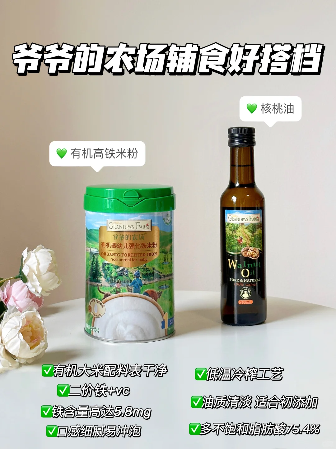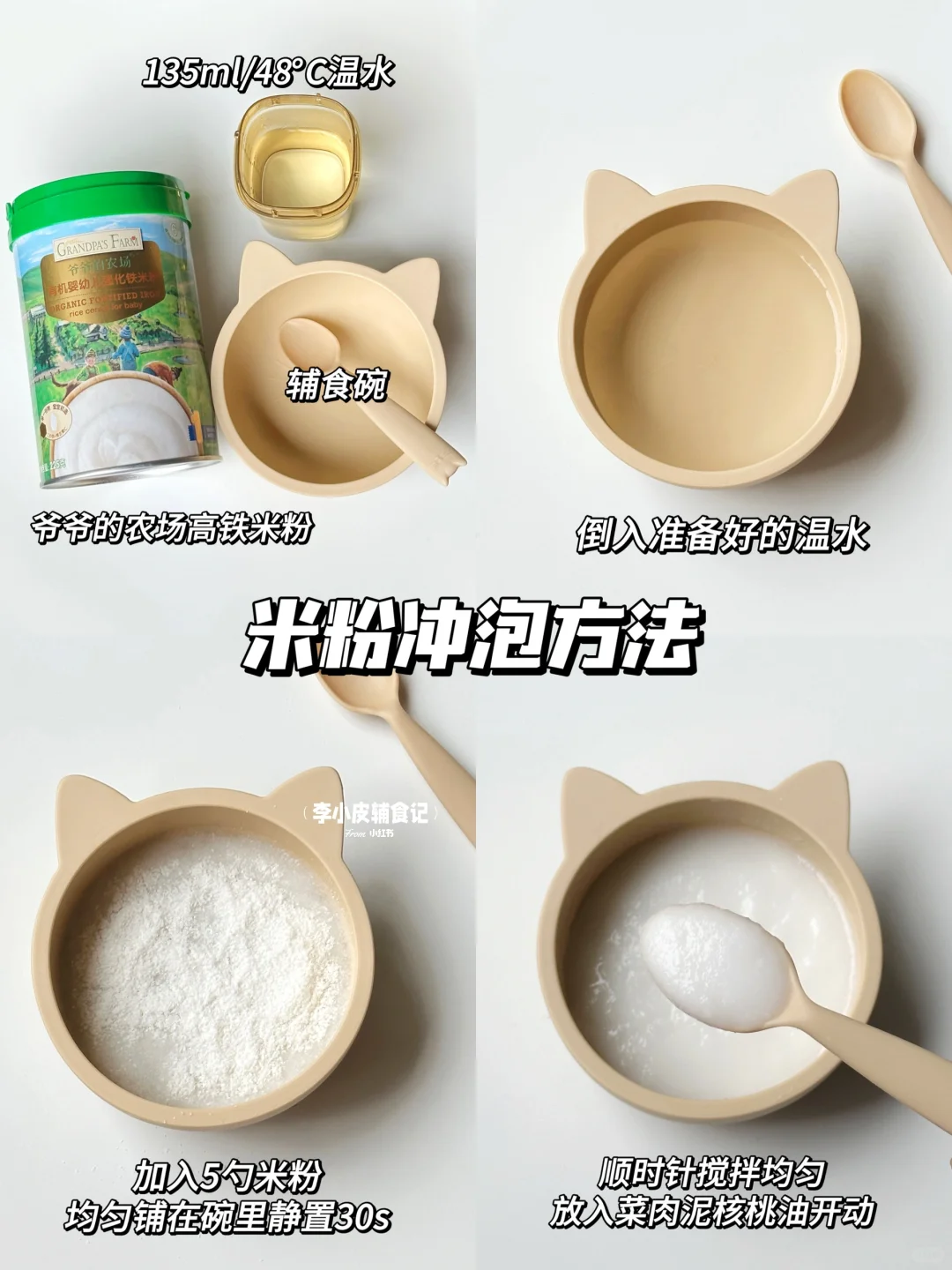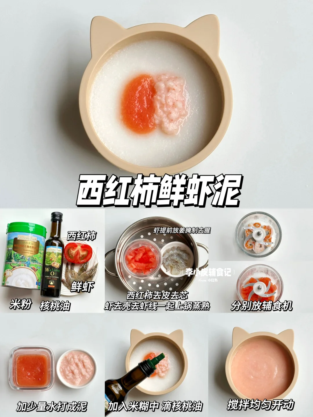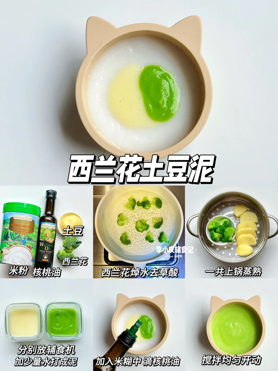 宝宝6月龄左右就可以开始添加辅食了,纯米粉吃一周之后就可以开始添加菜泥、肉泥,以及混合泥满足宝宝各方面的营养需求。 今天整理了几款营养辅食泥的制作方法和搭配,做法简单,给各位新手麻麻们做个参考❤️ 🥦西兰花土豆泥 🍅西红柿鲜虾泥 🥕胡萝卜土豆泥 紫薯山药泥 🥬菠菜蛋黄猪肉泥 🎃南瓜玉米鳕鱼泥 💚辅食添加顺序 辅食添加没有先后顺序,但宝宝的第①口辅食应是高铁米粉,刚开始添加以给宝宝试吃为主,目的是为了排敏,培养吃饭习惯。 米粉的浓稠度需要循序渐进,从稀糊状➡️酸 奶状 ➡️浓稠状 ➡️粘稠状 💚辅食制作要点 蔬菜类:需要先焯水再打成泥,可以更好的去掉杂质和草酸,焯水后直接剁碎即可。 根茎类:去皮切片蒸熟,加适量温水打成泥 肉泥类:需要去腥之后将生肉用辅食机打一遍,上锅蒸熟后再打一遍成泥,出来会更加细腻喔~ ⚠️辅食添加注意事项: 刚开始添加辅食建议选择在中午之前,如宝宝发现过敏反应方便更好处理 每种食材建议排敏3天,没有过敏情况就可以继续添加新的食材 新的食材可搭配已排过敏的食材一起吃,就可多吃到一种食物 营养更丰富 🌟米粉用的是爷爷的农场高铁米粉,选用有机大米制作,口感细腻好冲泡,铁含量高达5.8mg,还是二价铁➕VC组合,配料表也很干净,没有过敏源,易敏宝宝也可放心食用,铁罐包装,存放很方便~ 😋添加米粉一周后,就可以开始给宝宝添加辅食油啦~我搭配着用的是爷爷的农场核桃油,口感清淡宝宝更容易接受,采用低温冷榨工艺,多不饱和脂肪酸高达75.4%,淡淡的核桃清香,滴在米粉、粥辅食里吃宝宝很喜欢[赞R]