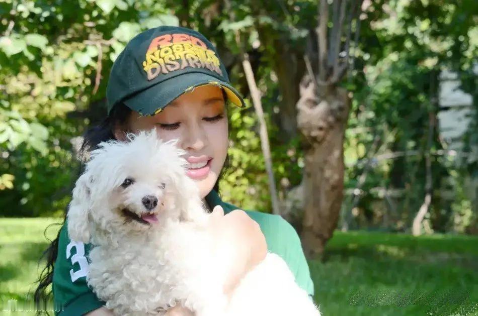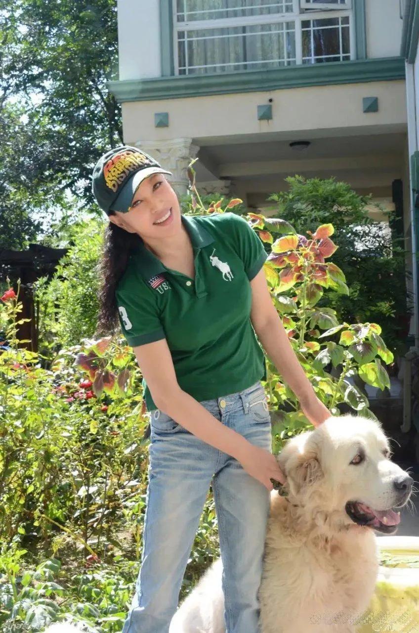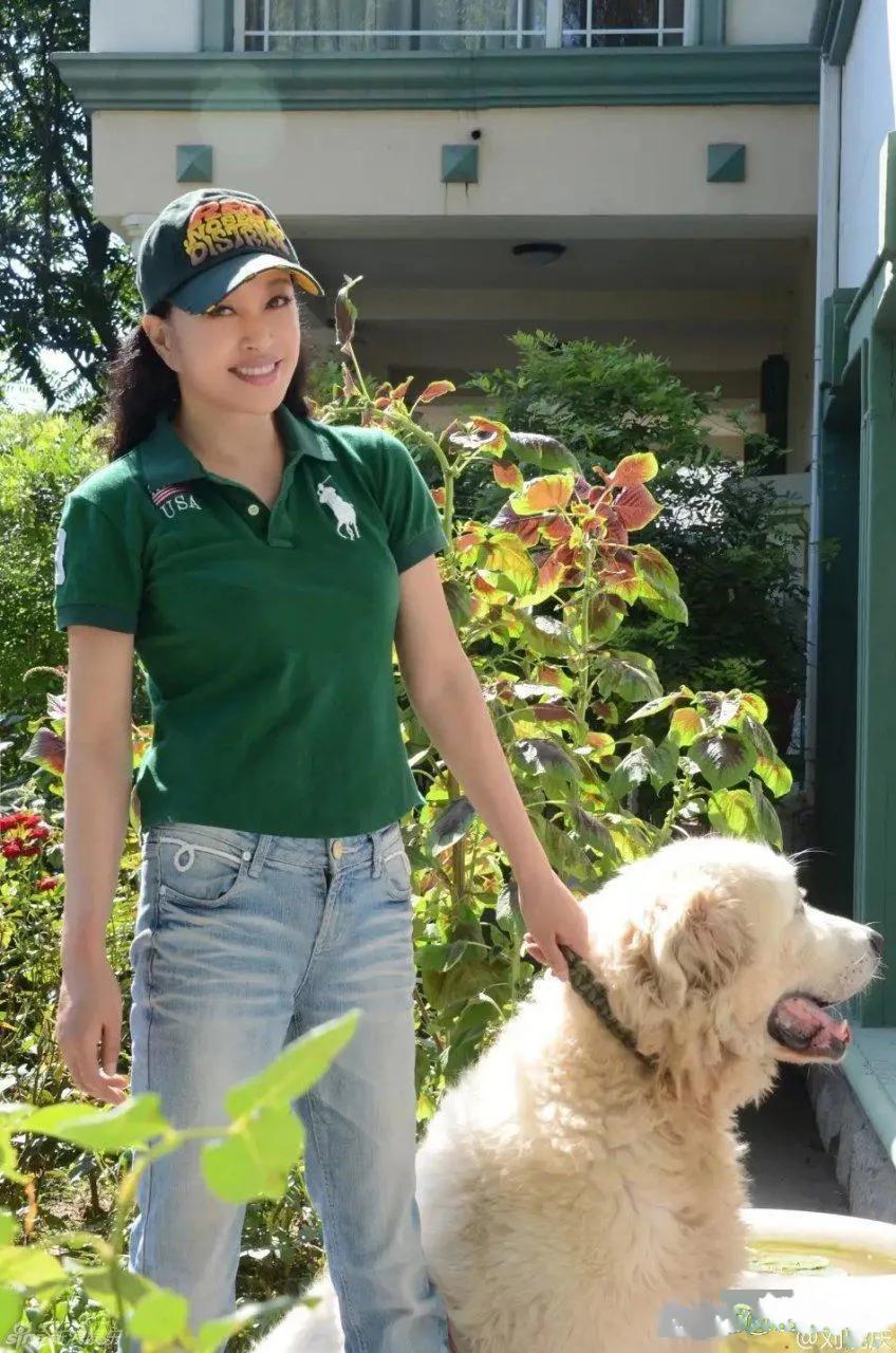 刘晓庆花园遛狗,头戴棒球帽,身穿绿色体恤衫配牛仔裤,腰上没一丝赘肉,身材曲线迷人