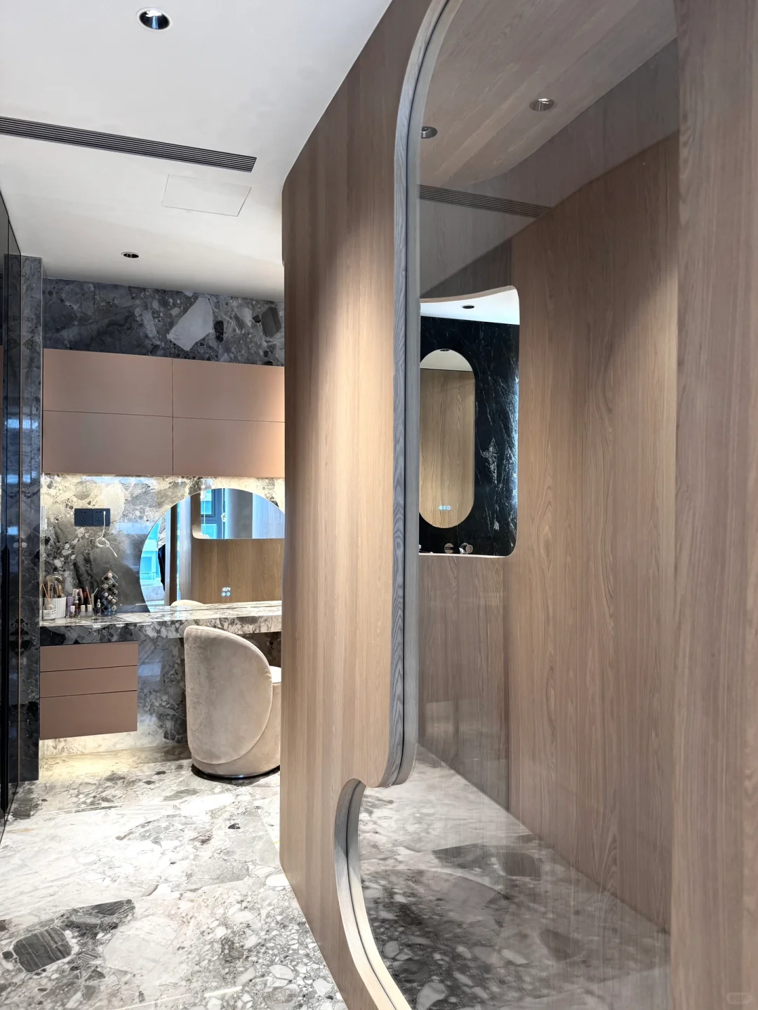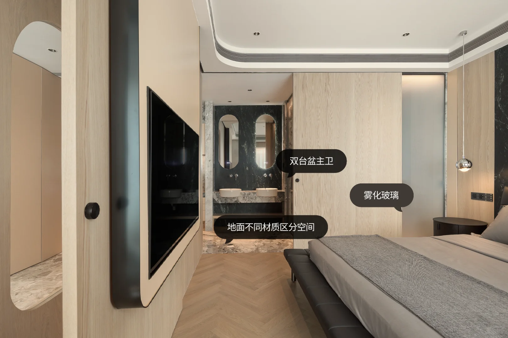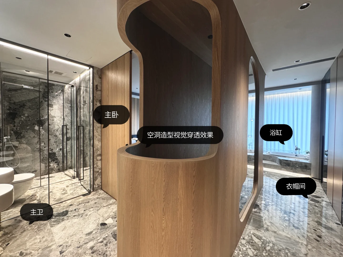 二层空间非常规平层,空间虽大但略有分散;我们借用空间的“散”将主卧、主卫、衣帽间、浴缸区区分,各个空间连贯而不独立,分散而不分开。保证私密的情况下拥有完整的享受空间[萌萌哒R]