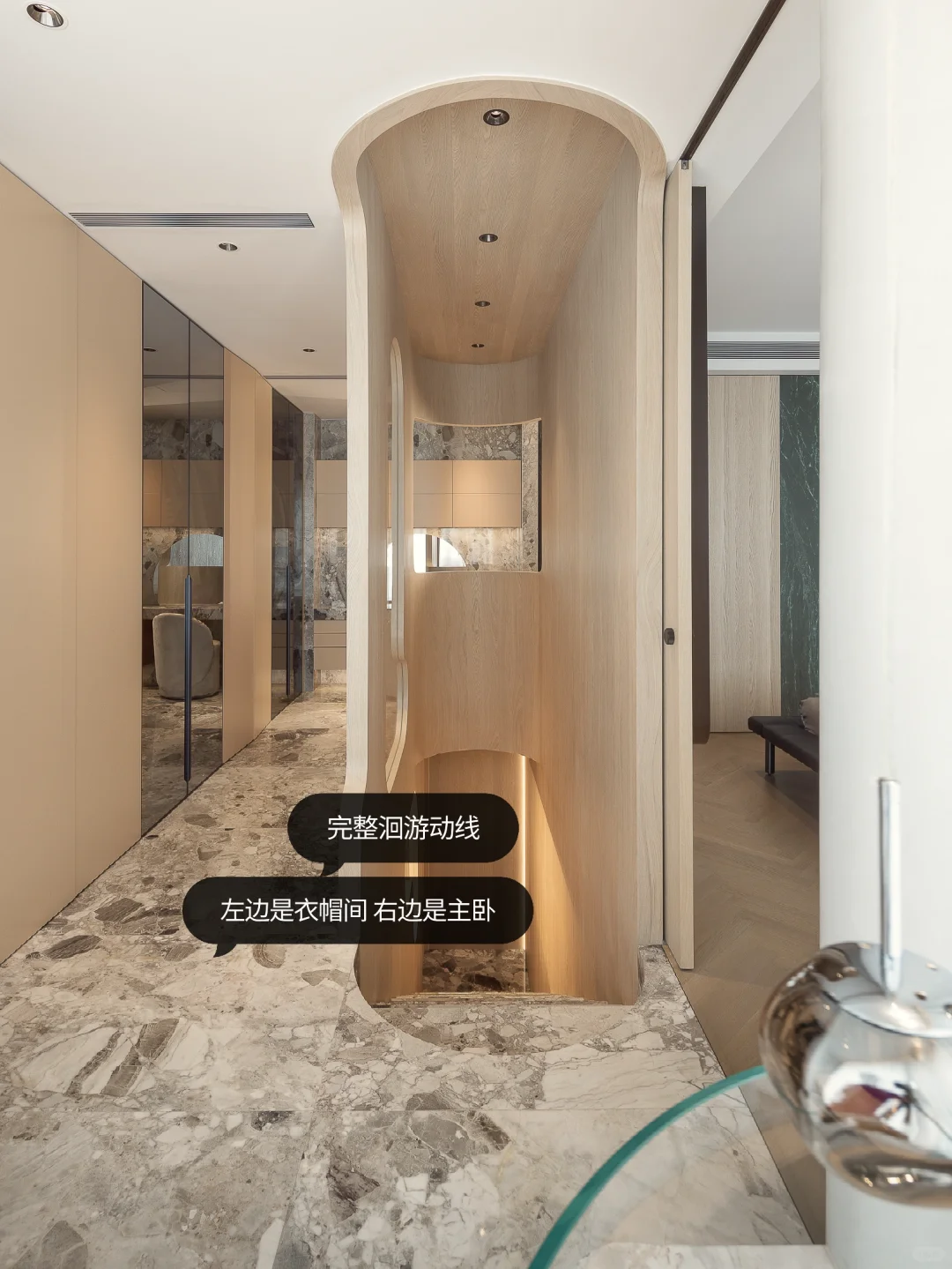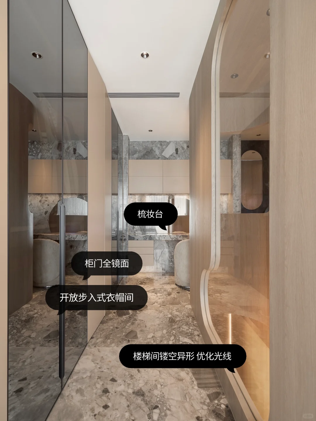 本案位于温州都会道壹号,是上下面积相差较大的错跃户型。原始户型中错跃二层面积较小,楼梯间占地面过大,原始二层作为主卧不够宽敞。我们修改为:移动原始楼梯间位置居中,将卧室、卫生间、浴缸等空间做半敞开式处理。原始楼梯推门由二楼入口移动至一楼入口,变相扩张二楼面积;在楼梯门安装门锁,同时保证二楼拥有完全独立的隐私性[自拍R]