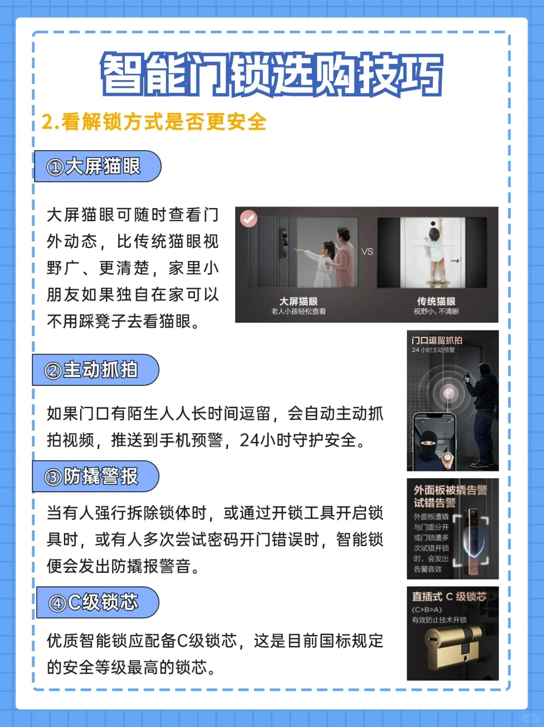 是否有大屏猫眼、主动抓拍、防撬报警、C级锁芯等