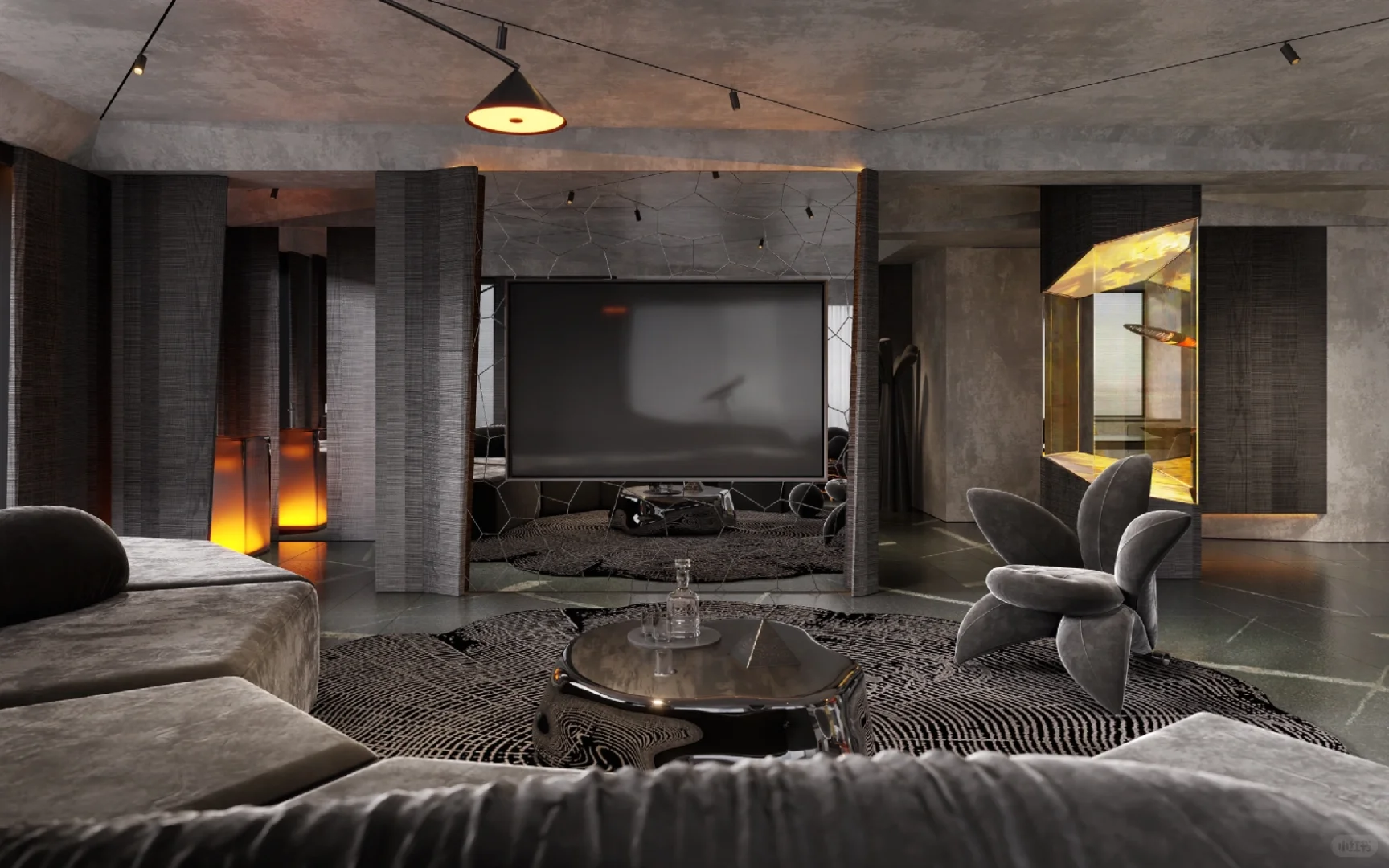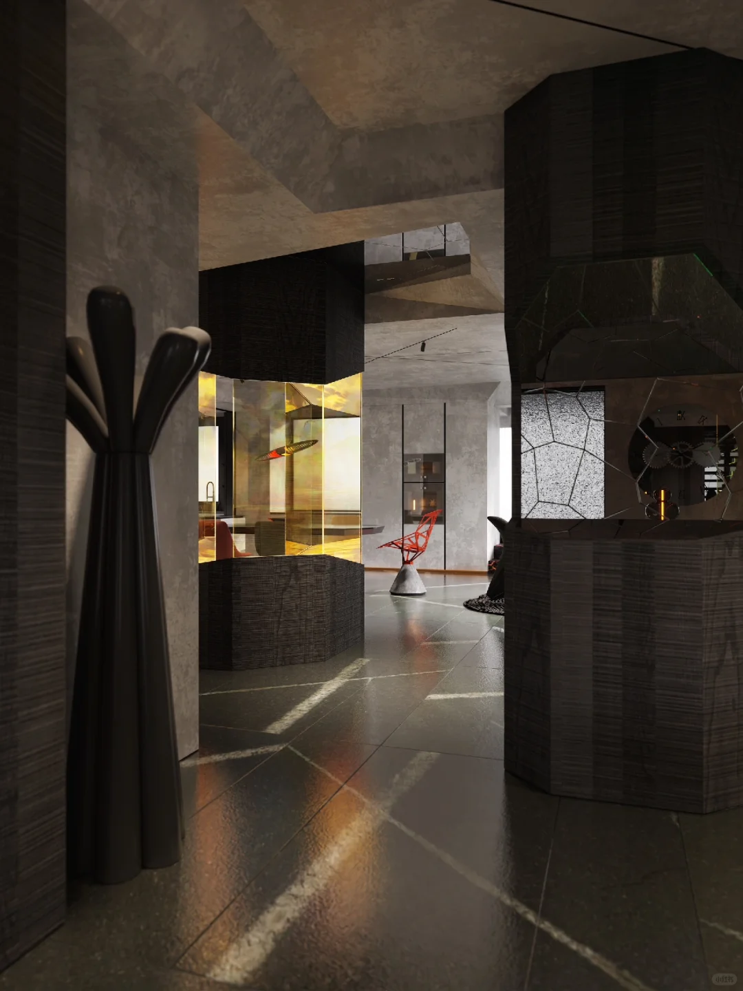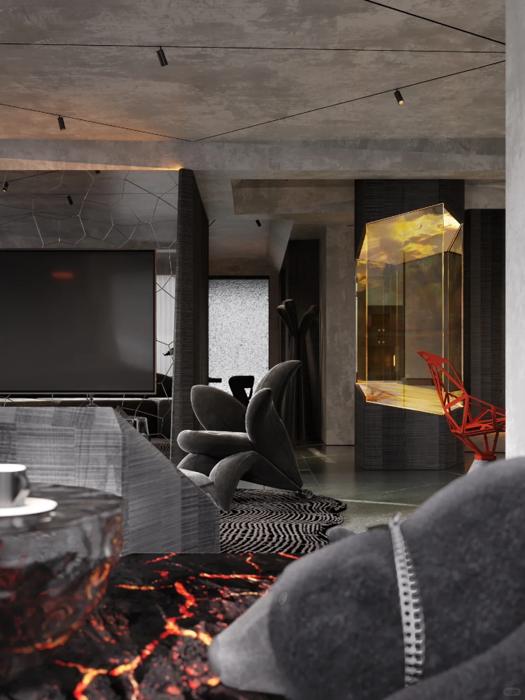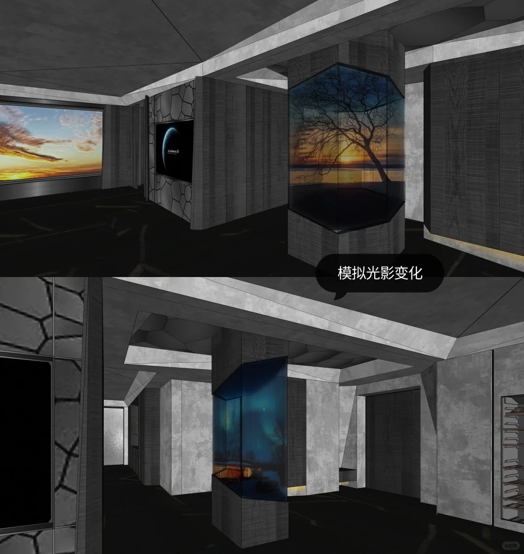 我们在家庭空间内设计艺术装置,摆放于原始玄关位置。它代替玄关成为家中的重要分子:是硬装的艺术,是氛围的来源。室内静谧幽暗的色调如同一整面的幕布,利用艺术装置的投影来模拟自然景观,无论是挪威的极光还是新疆的草原,无论窗外是阴天还是晴天,生活场景的变幻随主人的心情而变,室内的氛围完全由主人调动。大胆设计的艺术装置在家中落地,改变生活。
