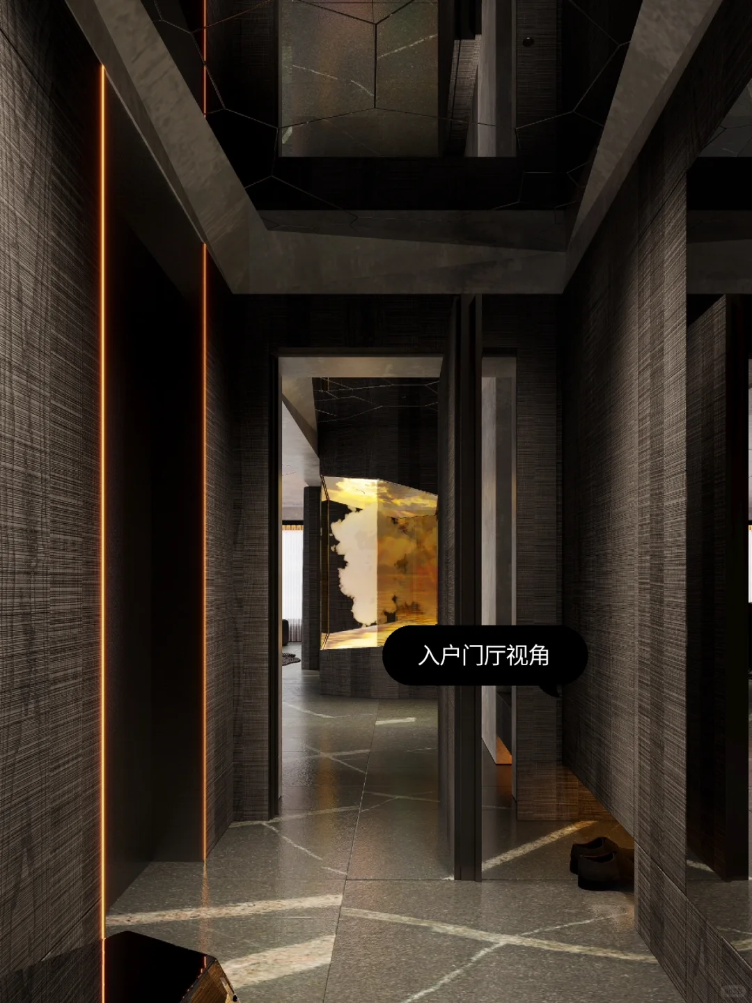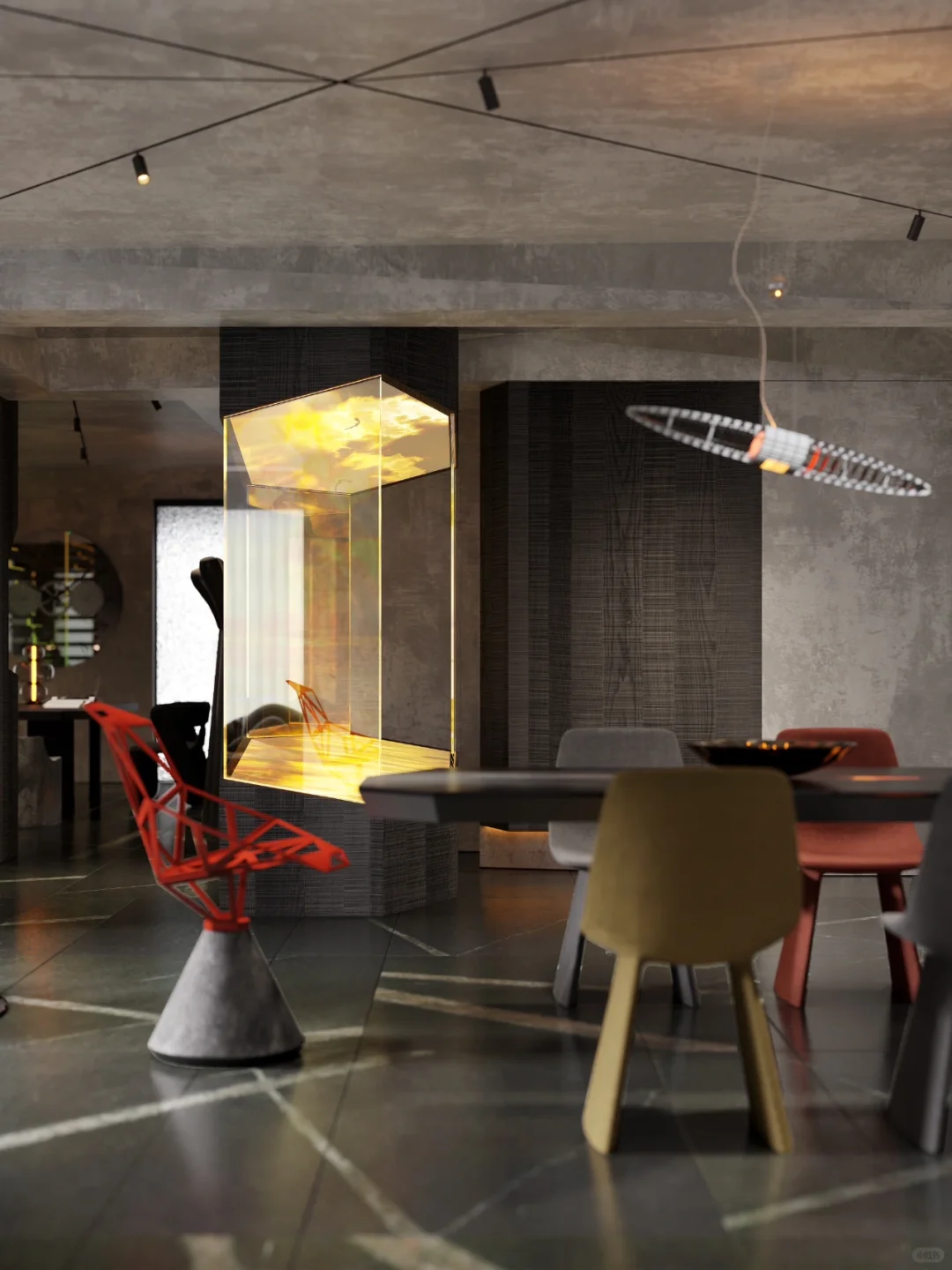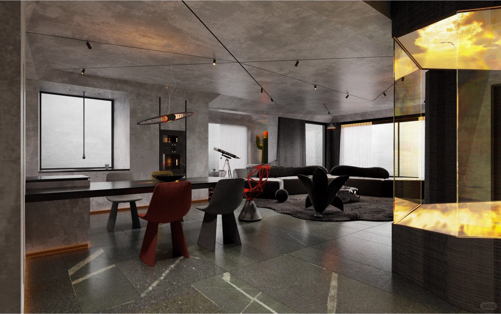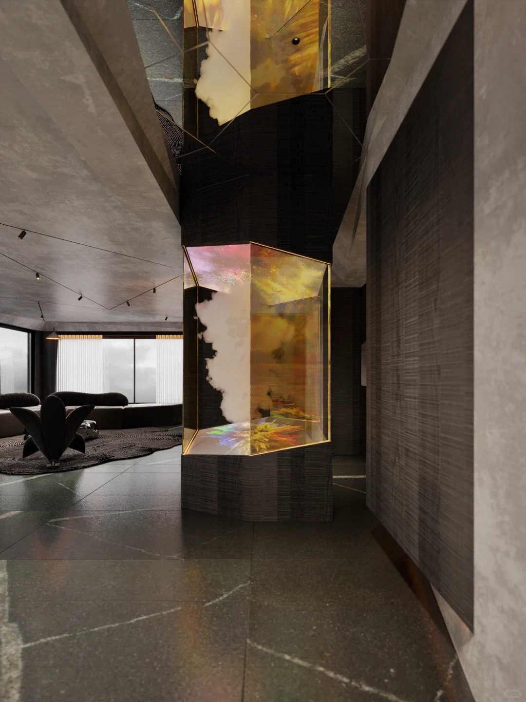 我们在家庭空间内设计艺术装置,摆放于原始玄关位置。它代替玄关成为家中的重要分子:是硬装的艺术,是氛围的来源。室内静谧幽暗的色调如同一整面的幕布,利用艺术装置的投影来模拟自然景观,无论是挪威的极光还是新疆的草原,无论窗外是阴天还是晴天,生活场景的变幻随主人的心情而变,室内的氛围完全由主人调动。大胆设计的艺术装置在家中落地,改变生活。