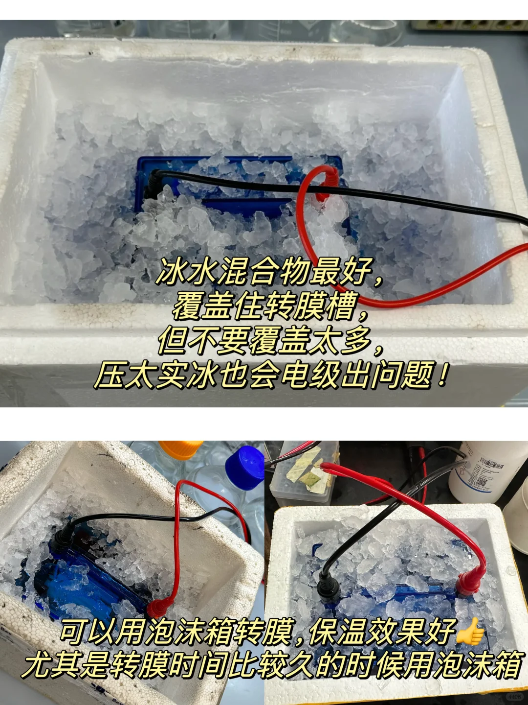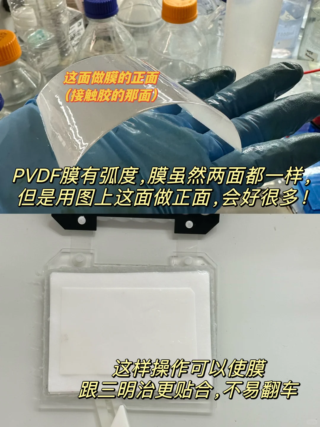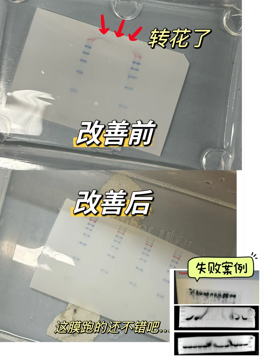 以前转膜隔三差五失败,跑胶跑的好好的,转膜结束后marker和蛋白都花了,现在找到一些实用型小技巧后,基本没翻过车了。😬 ✅1、转膜液提前预冷,跑上胶后就放负20,等转膜时已经是很冰的状态,也可用免冰浴转膜液,但个人使用感受是提前预冷效果更好; ✅2、pvdf膜激活,变完全半透明后即可使用; ✅3、pvdf膜有弧度,选择凸的那面为正面,贴合性更好(如图3所示); ✅4、转膜夹微微鼓包,略紧就行,不要夹太厚太紧,反而容易失败; ✅5、亲测免滤纸转印棉好用,也不掉屑,贴合性很好(图7); ✅6、别用掉屑的和很新的滤纸,略旧不掉屑的滤纸转膜效果zui佳,【新滤纸硬,用几次变软一些会更好用!】; ✅7、冰水混合物转膜效果zui好,降温快,略盖过转膜槽即可,捂的太严实电级容易损坏; ✅8、若转膜时间久,可用泡沫箱➕冰水混合物转膜,保温效果好; ✅9、小蛋白用0.22um的膜,别用0.45的。理论上是1kd/1min。 转膜的小技巧目前总结大概就这么多~ 1️⃣小贴士:转膜时可以带两层手套,夏天还好,尤其是冬天,转膜接触冰和凉水的痛应该很多人都懂…戴🧤时里面可套一层塑料薄膜手套,会厚实很多~也很好脱下来‼️ 2️⃣ps: 1、日常手基本就是完全浸泡在冰冷的转膜液中去操作…时间久了真的遭不住,尤其是本身体质就比较虚的,经常碰冰水尤其姨妈期,久而久之直接姨妈出走,日常科研压力也大,直接一整个失调,身边姨妈不准的朋友还挺多的。 2、科研女民工有些失调是正常的,日常多运动,调理一下身体会好很多,大家可以试试“千金益母颗粒”,调经活🩸化淤效果很可! ➡️是组方搭配:益母草,当归是活🩸调经的;川芎,木香是行气止疼的,四味中yao材,效果比其他单一只有益母草的好hen多~上个月姨妈推迟好几天了,这个月就是靠它催来的😂。 ➡️千金益母颗粒是用的益母草是童子益母草哦,和普通的益母草还不太一样,补气调经xiao果👍 ➡️用法是:一次一包,两次,里面加了蔗糖,味道口感都不苦 ✅注意:益母颗粒适合月经不调,痛经的姐妹,要姨妈前喝,姨妈期间别喝,不然容易🩸泛滥~